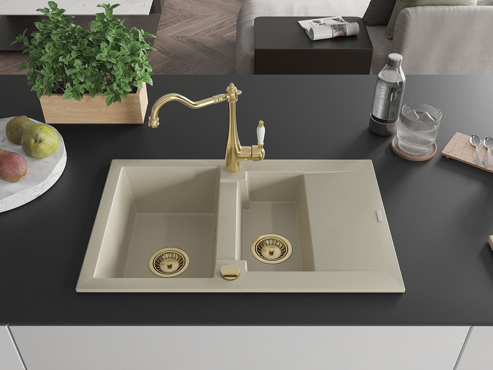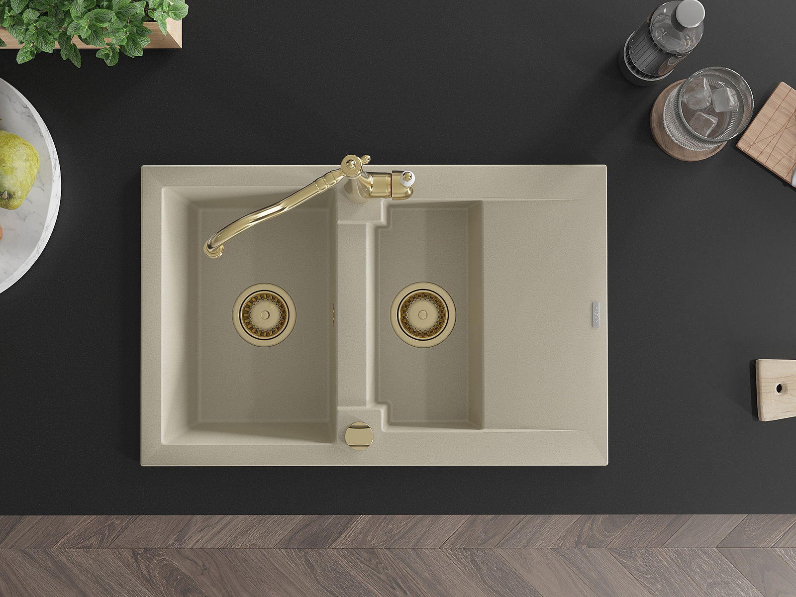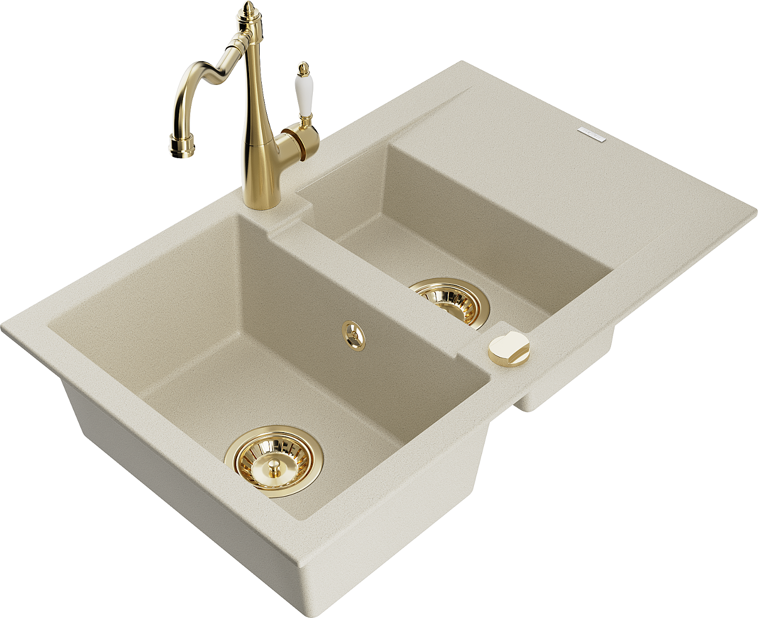 Mexen Gaspar évier en granit 1,5 bac avec égouttoir et mitigeur de cuisine Carla, beige - 6507-69-670700-50