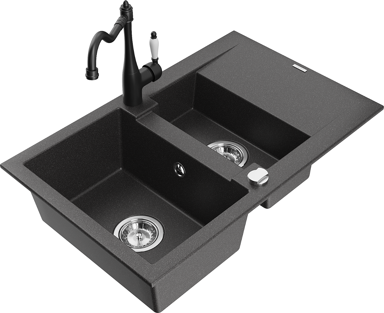 Mexen Gaspar évier en granit 1,5 bac avec égouttoir et robinet de cuisine Carla, noir moucheté - 6507-76-670700-70