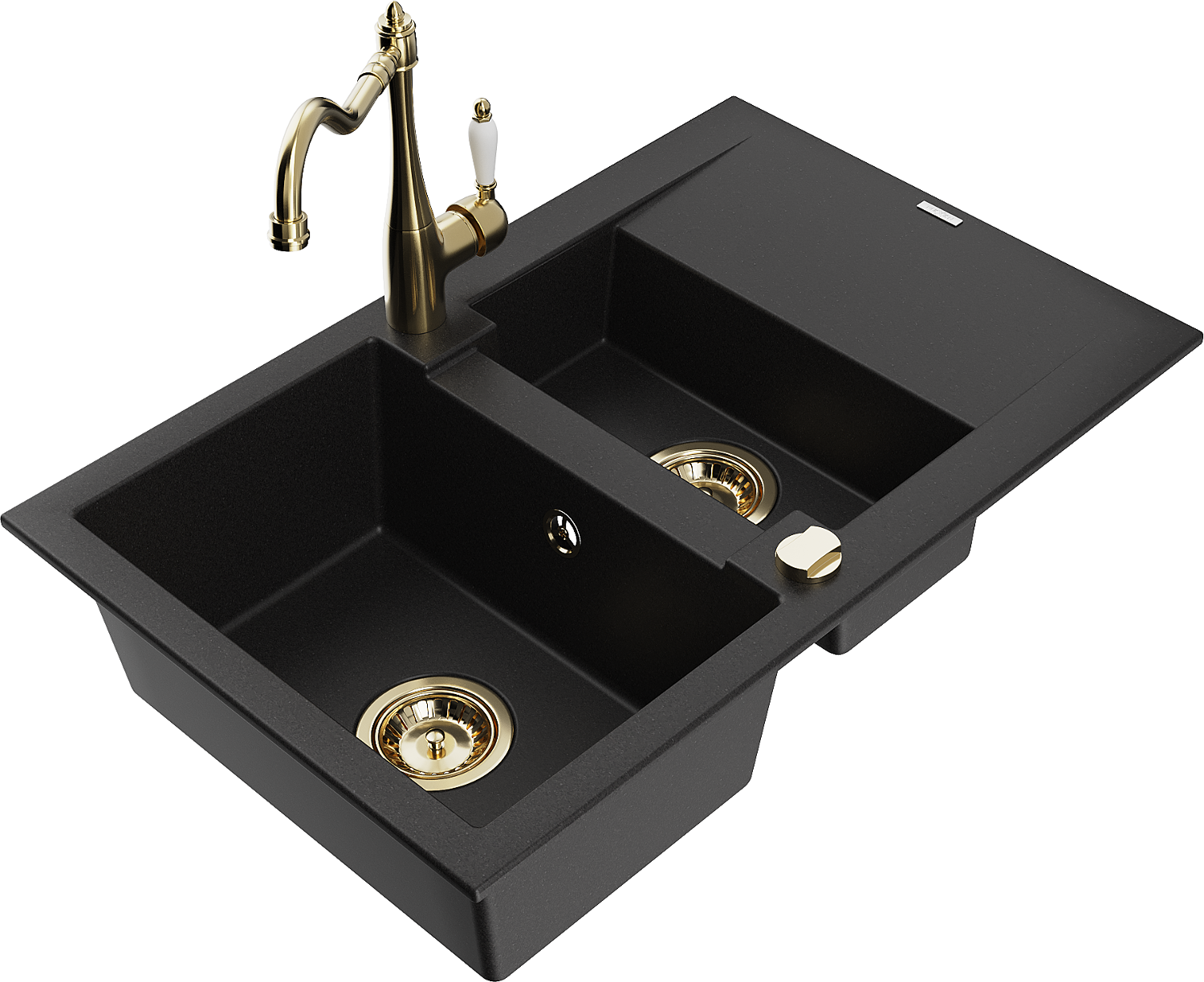 Mexen Gaspar évier en granit 1,5 bac avec égouttoir et robinet de cuisine Carla, noir - 6507-77-670700-50