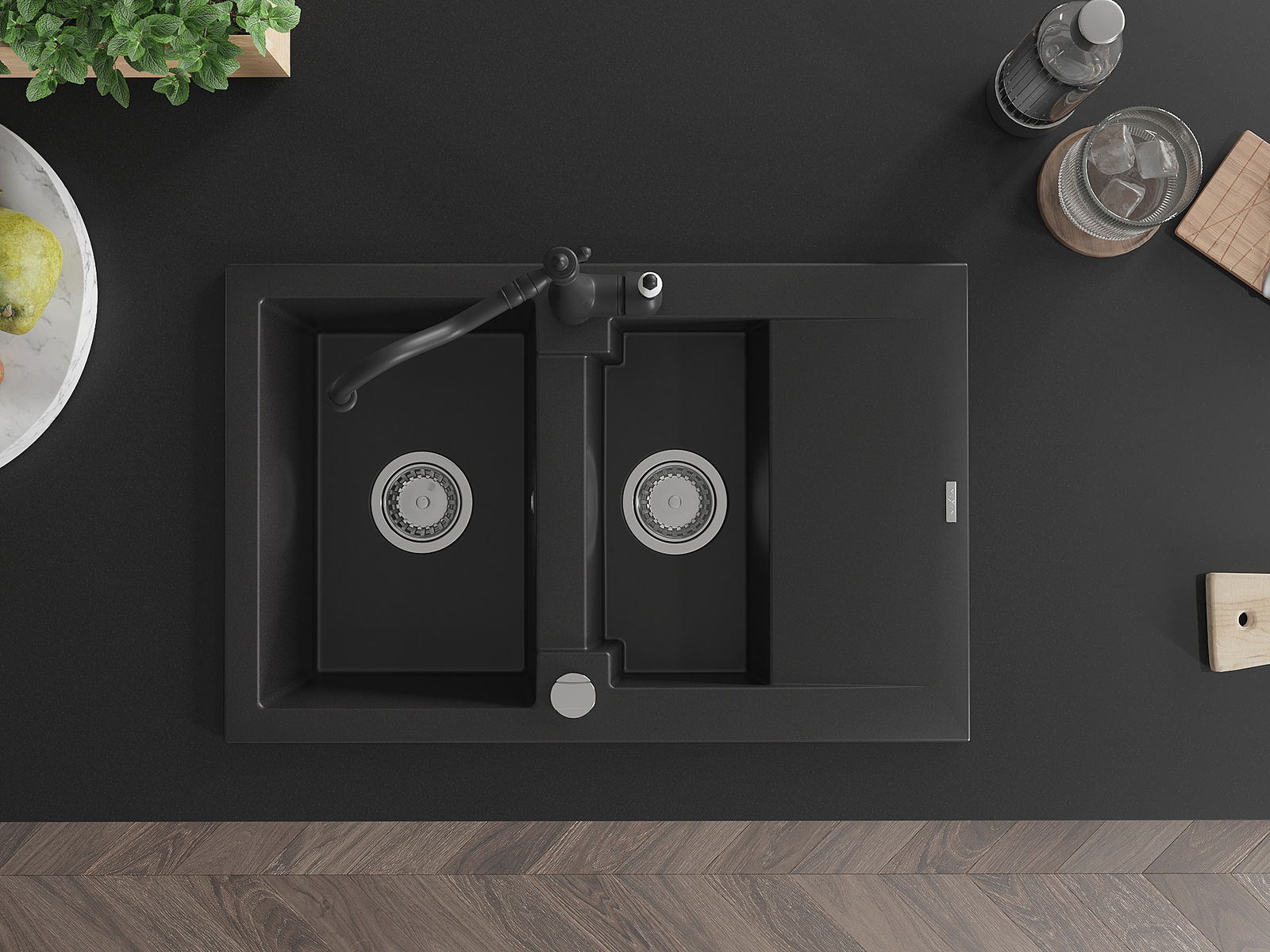 Mexen Gaspar évier en granit 1,5 bassin avec égouttoir et mitigeur de cuisine Carla, noir - 6507-77-670700-70