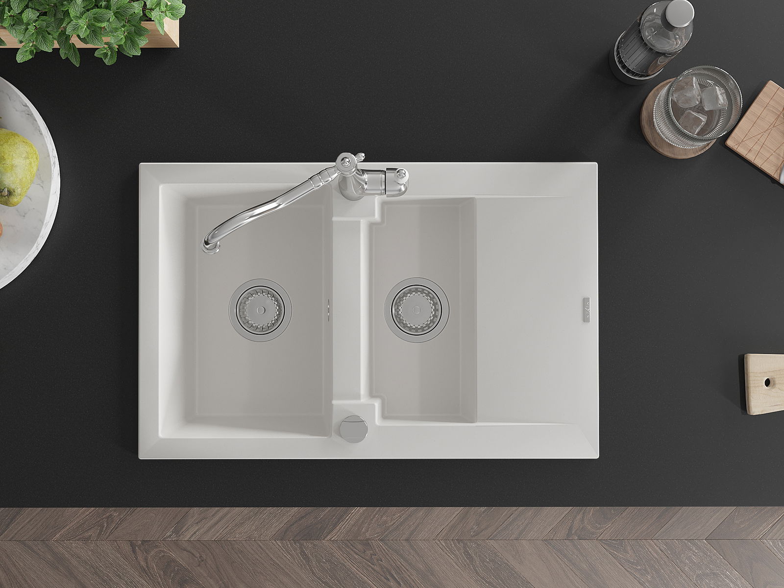 Mexen Pablo évier en granit 1 bac avec égouttoir et mitigeur de cuisine Carla, blanc - 6510-20-670700-00