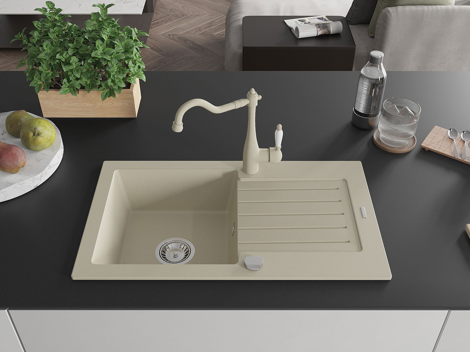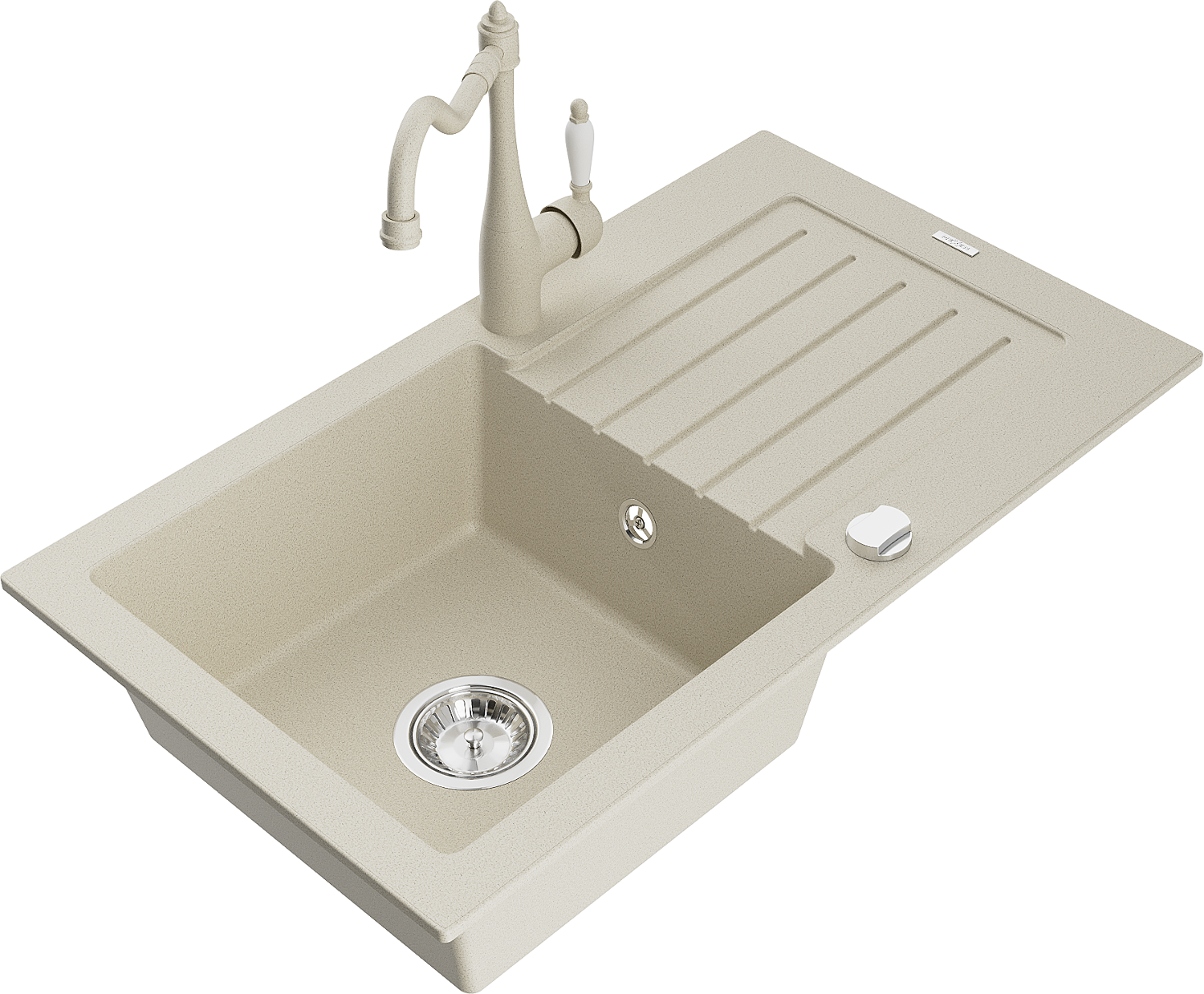 Mexen Pablo évier en granit à 1 bac avec égouttoir et robinet de cuisine Carla, beige - 6510-69-670700-69