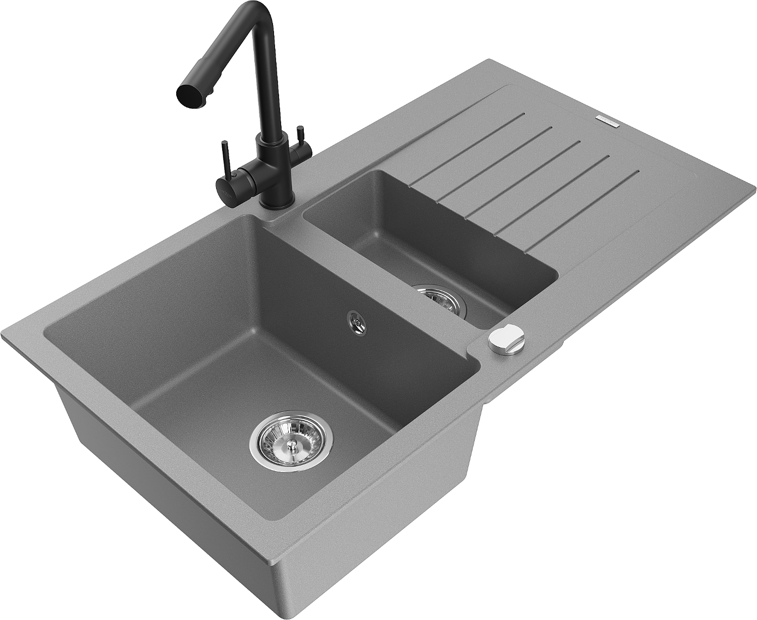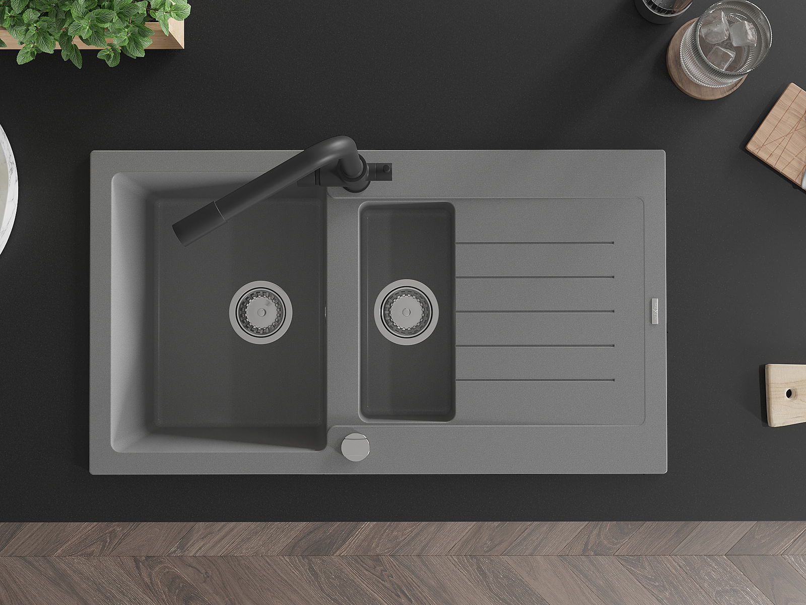 Mexen Matias évier en granit 1,5 bac avec égouttoir et robinet de cuisine Duero, gris - 6502-71-671600-70