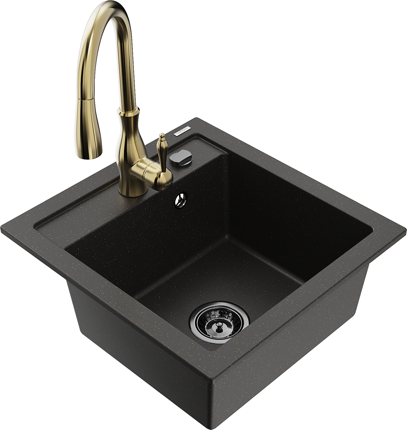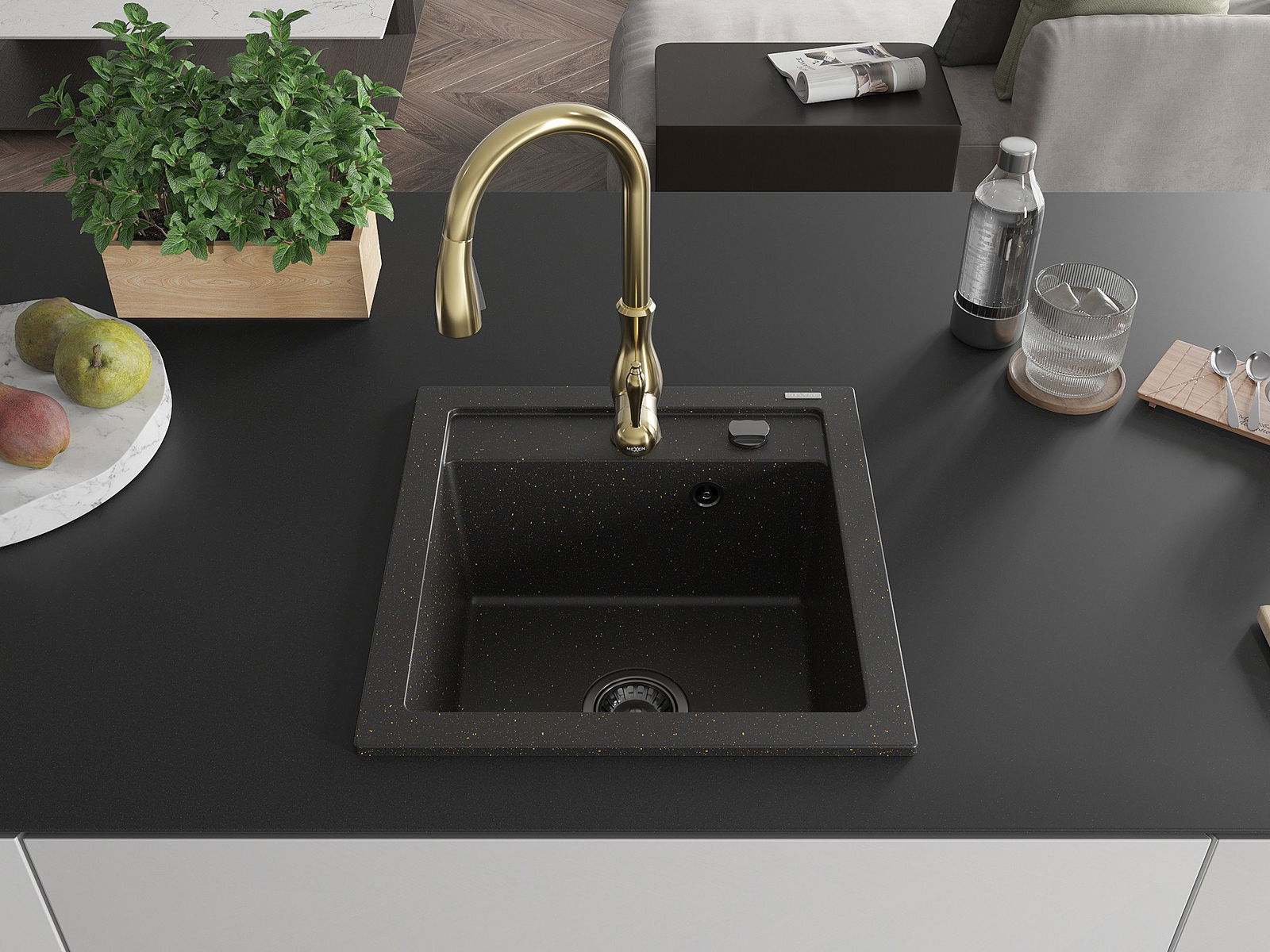 Mexen Vito évier en granit 1 bac avec mitigeur de cuisine Savita, noir/or métallique - 6503-75-672601-50-B