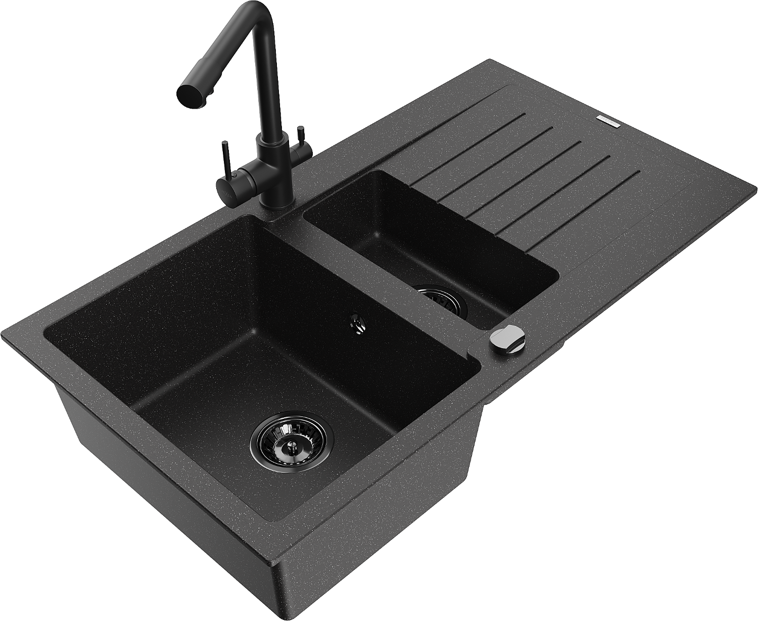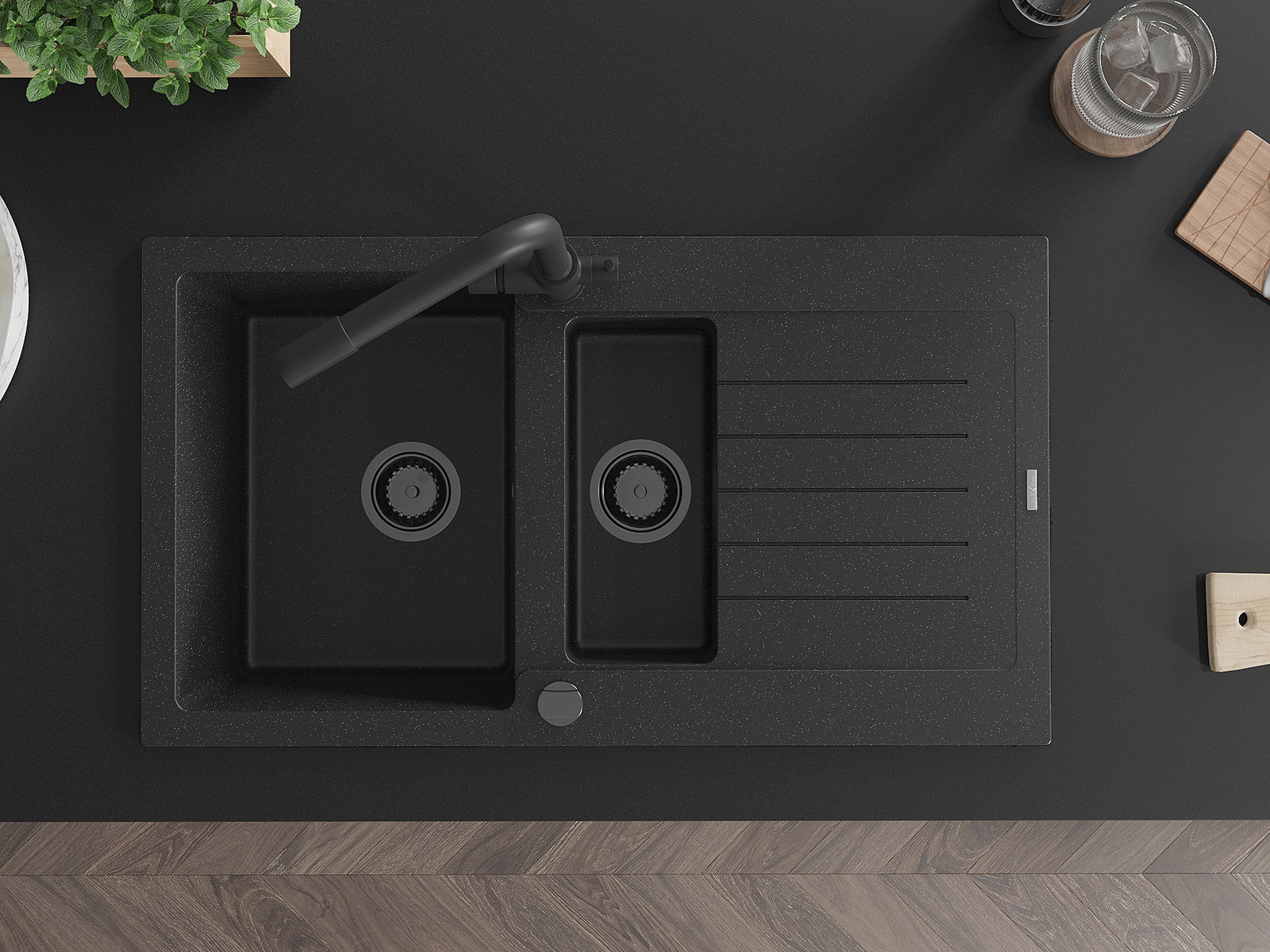 Mexen Matias évier en granit 1,5 bac avec égouttoir et mitigeur de cuisine Duero, noir/argent - 6502-73-671600-70-B