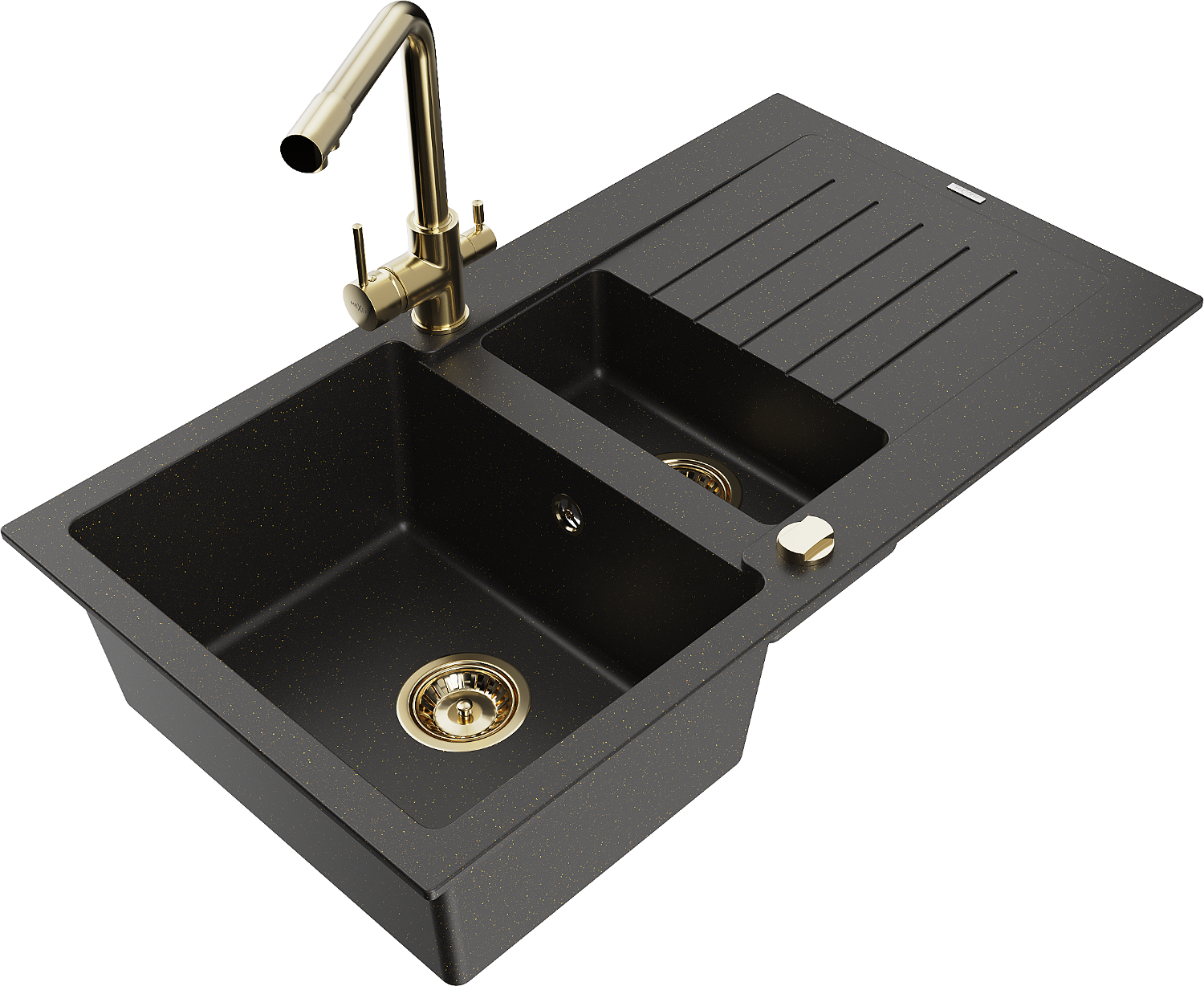 Mexen Matias évier en granit à 1,5 cuve avec égouttoir et robinet de cuisine Duero, noir/or métallisé - 6502-75-671600-50