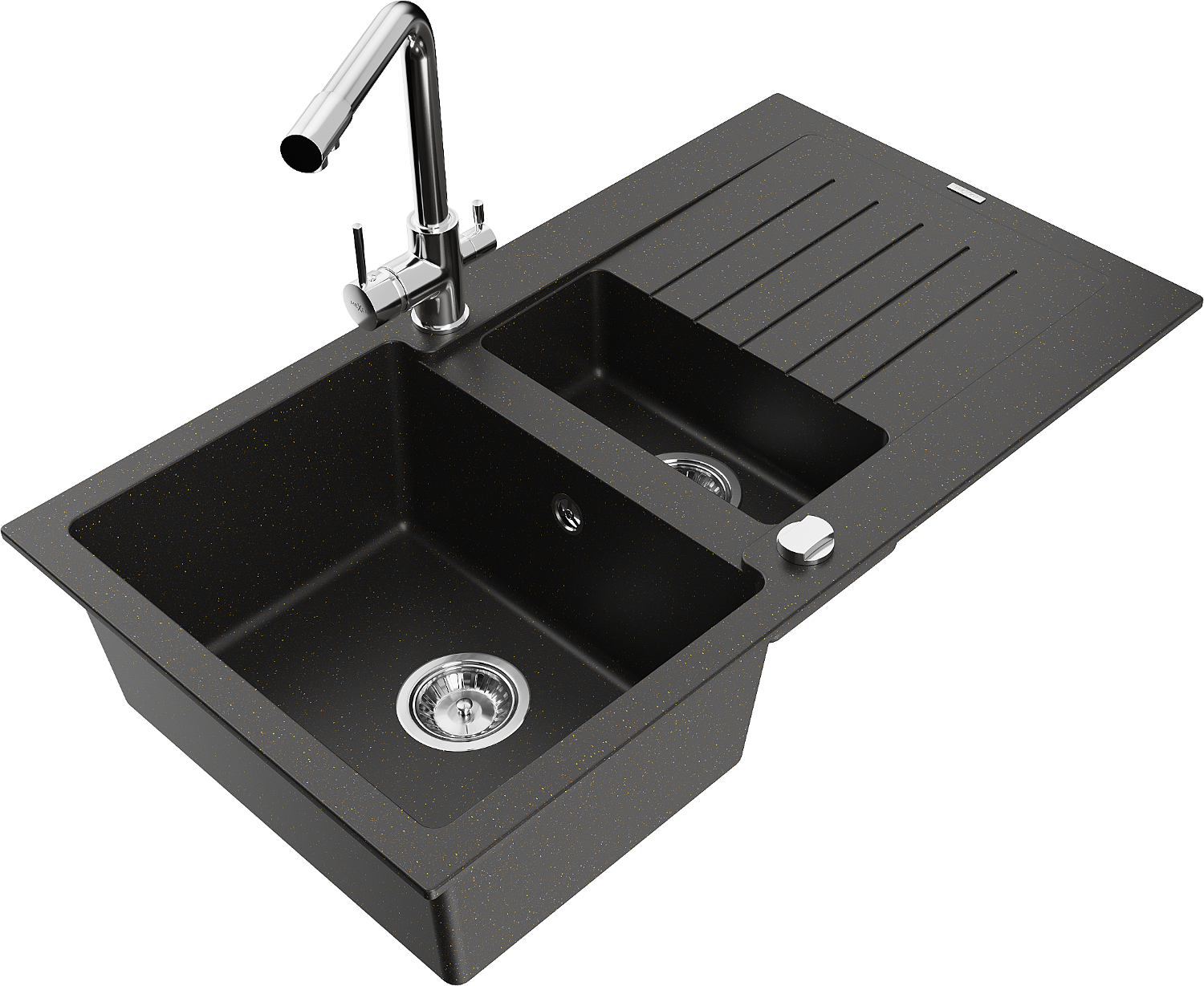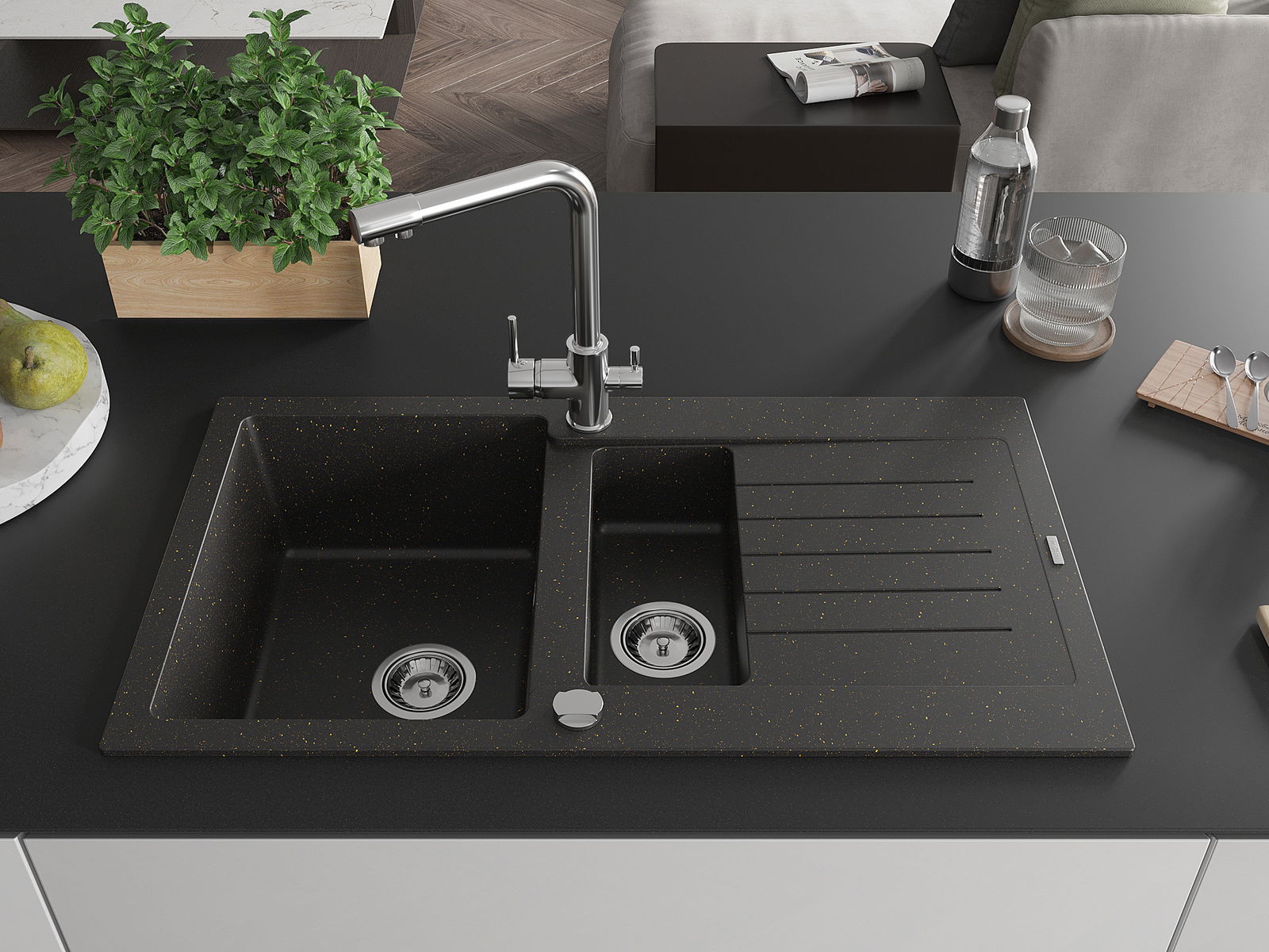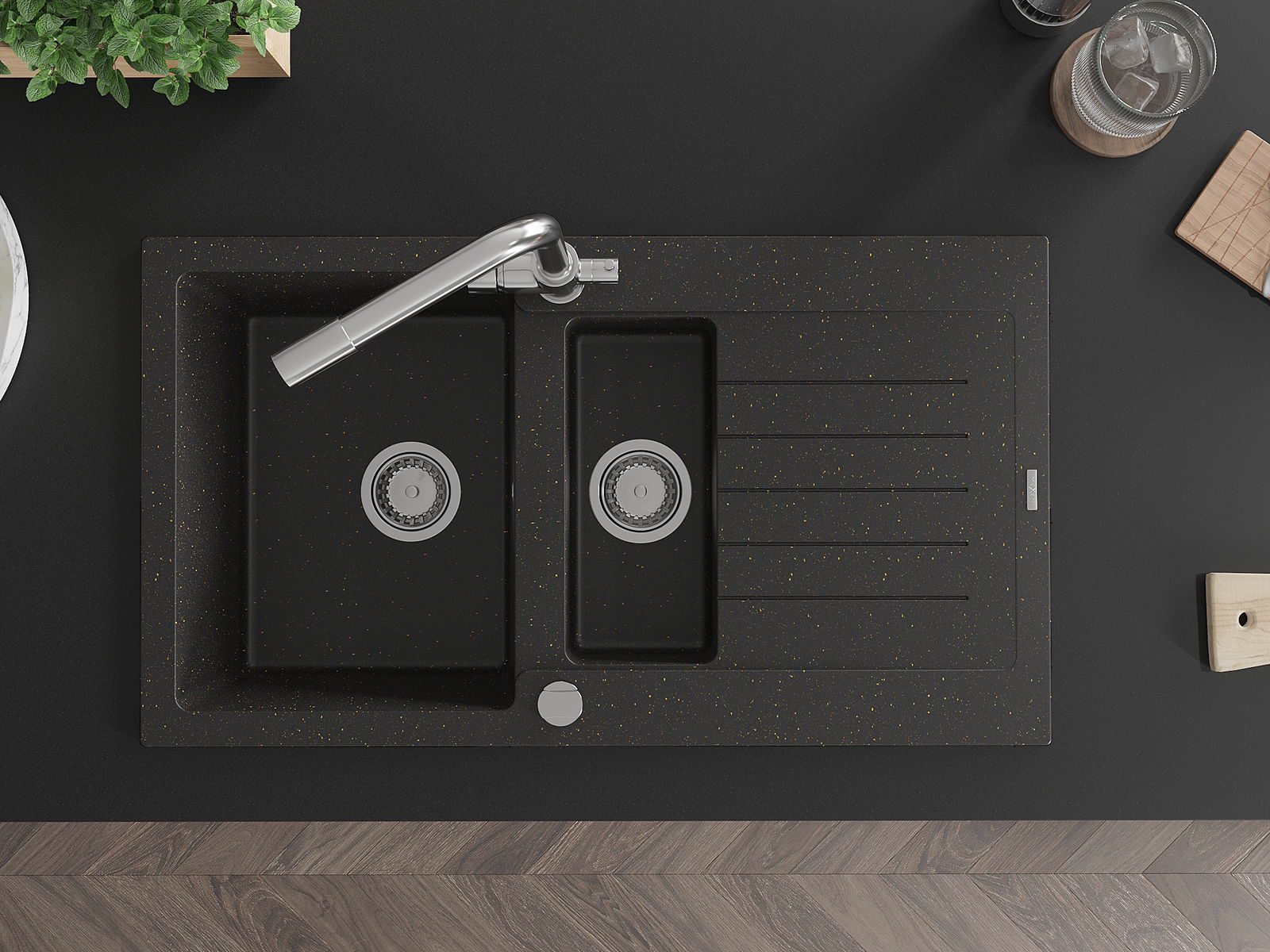 Mexen Matias évier granitique 1,5 bacs avec égouttoir et robinet de cuisine Duero, noir/or métallique - 6502-75-671600-00