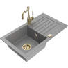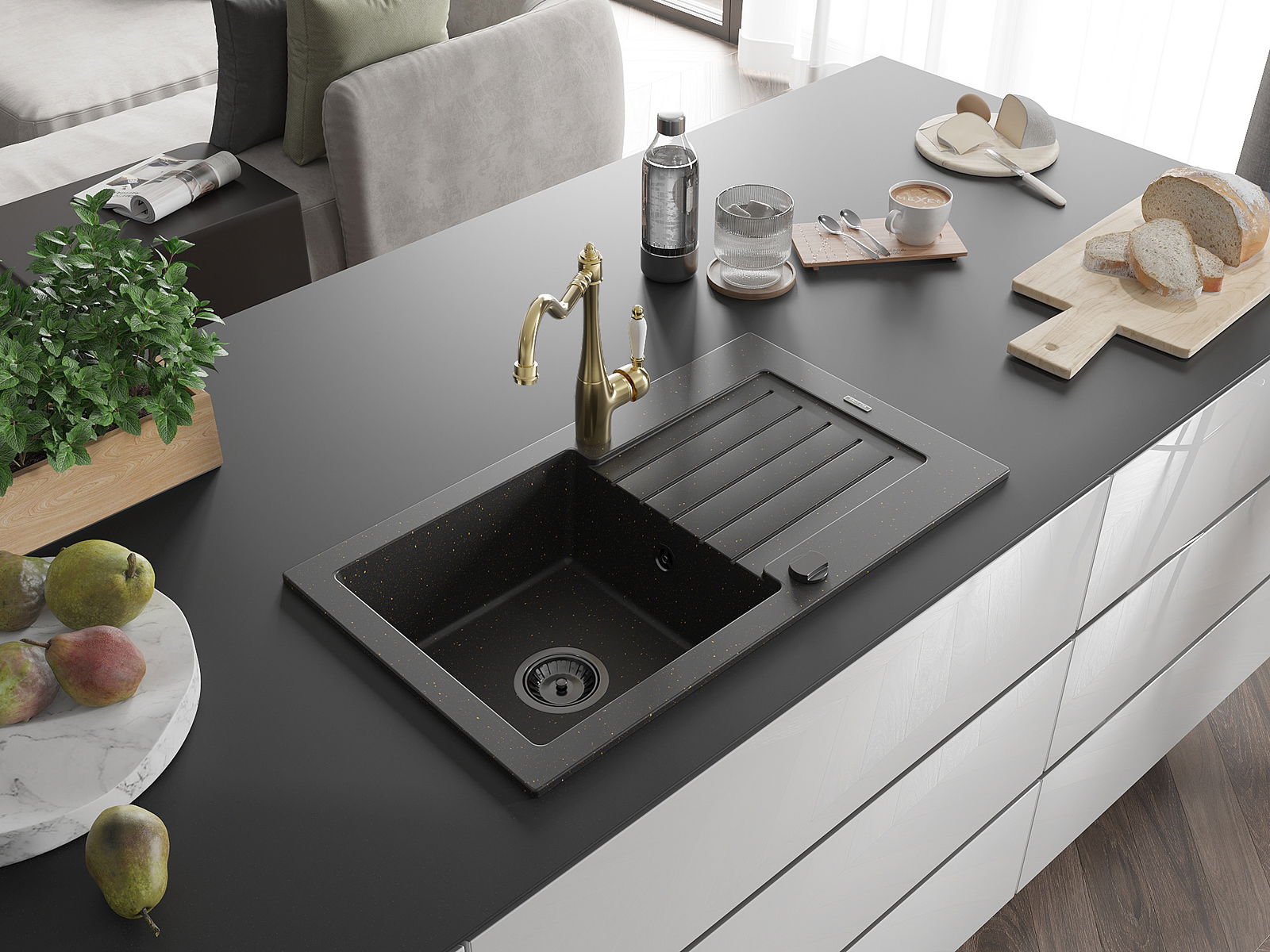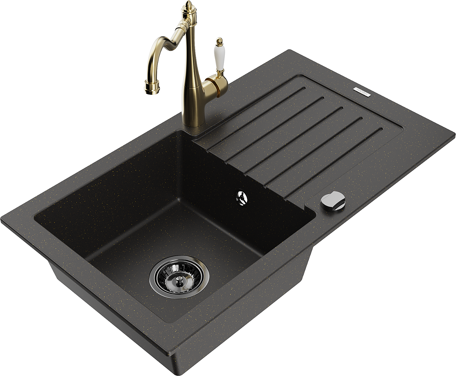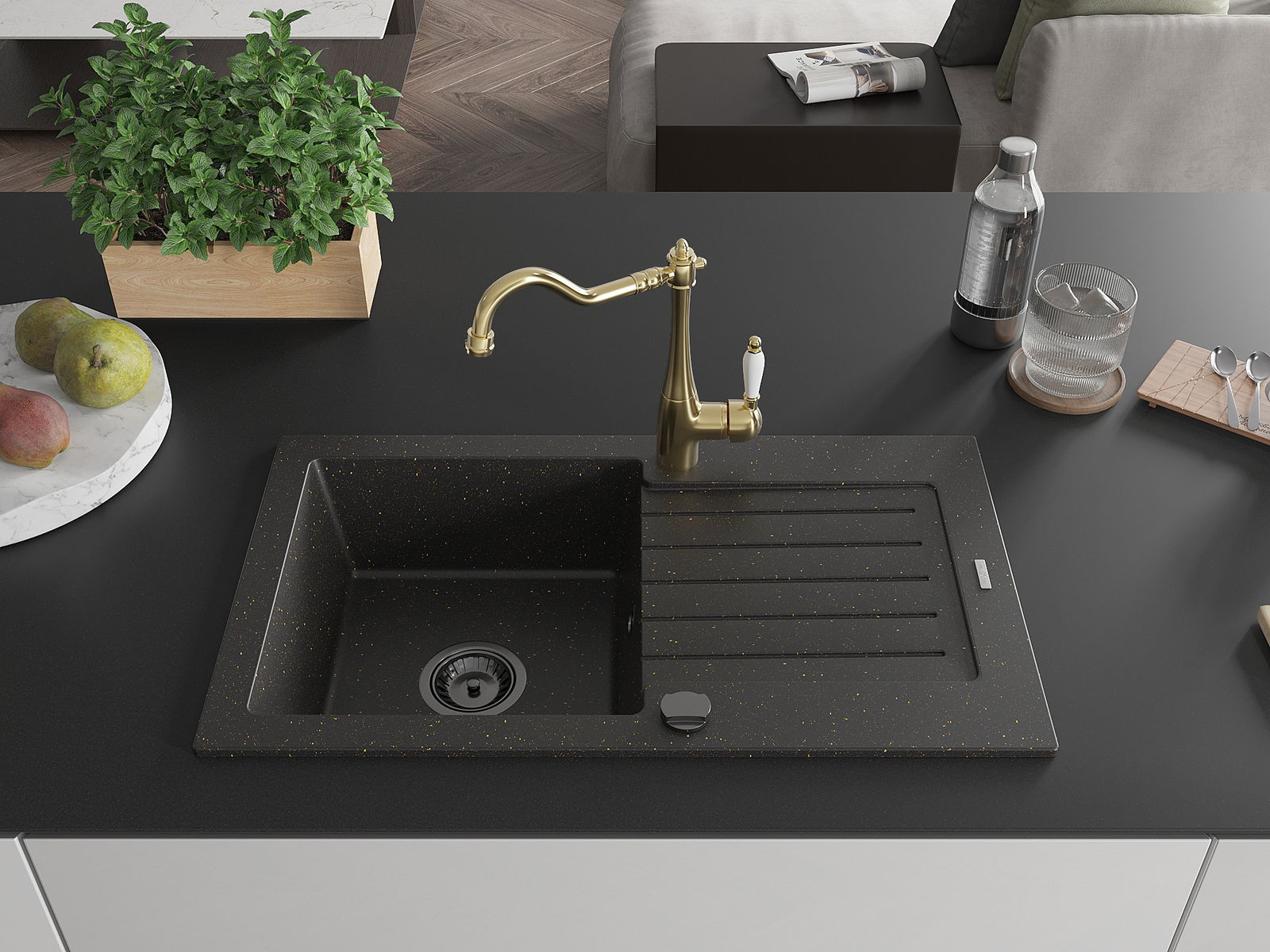 Mexen Pablo évier en granit 1 bac avec égouttoir et robinet de cuisine Carla, noir/or métallique - 6510-75-670700-50-B