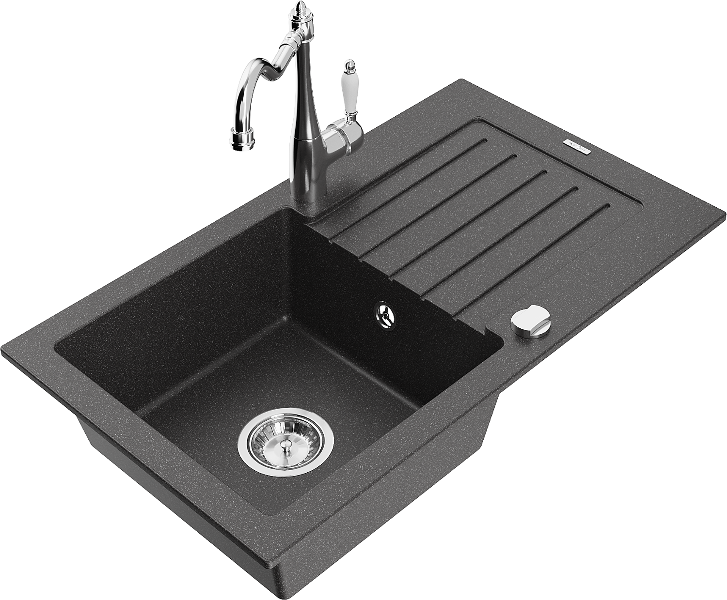 Mexen Pablo évier en granit à 1 bac avec égouttoir et robinet de cuisine Carla, noir moucheté - 6510-76-670700-00