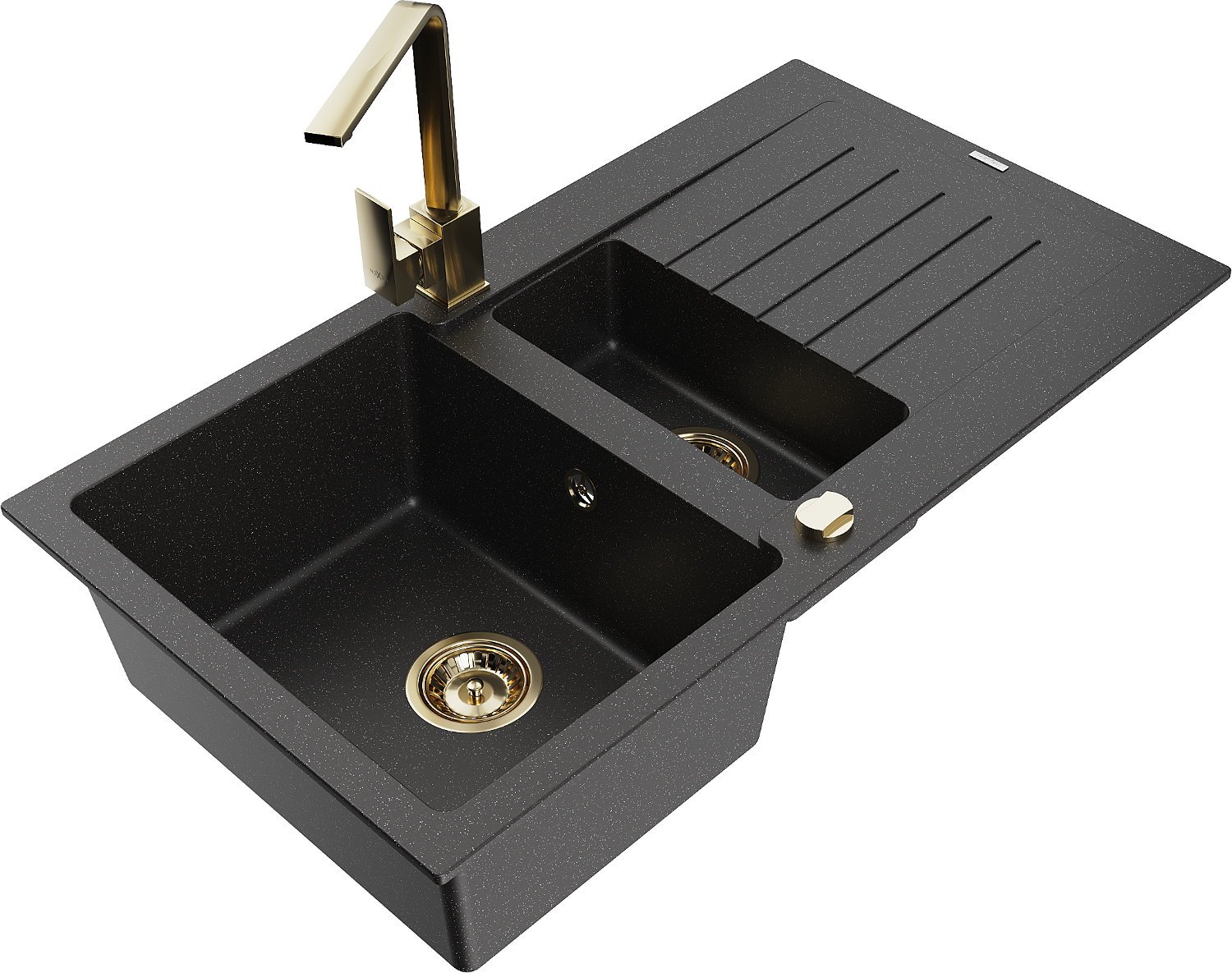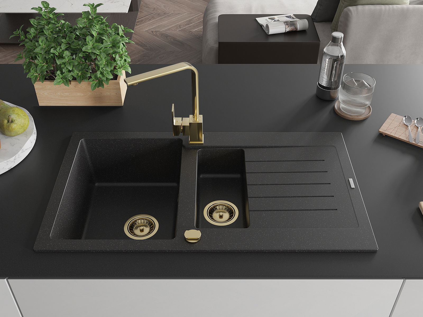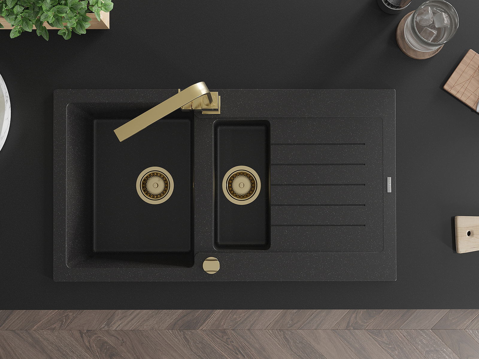 Mexen Matias évier en granit 1,5 bac avec égouttoir et mitigeur de cuisine Rita, noir/argent métallisé - 6502-73-670300-50