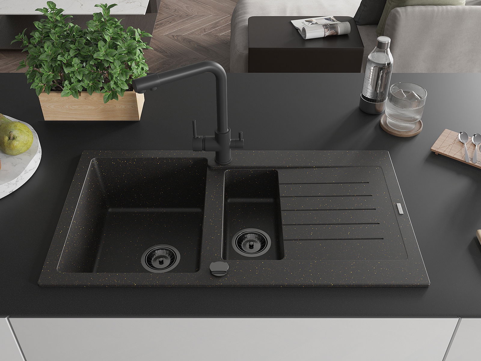 Mexen Matias évier en granit 1,5 bac avec égouttoir et robinet de cuisine Duero, noir/doré - 6502-75-671600-70-B