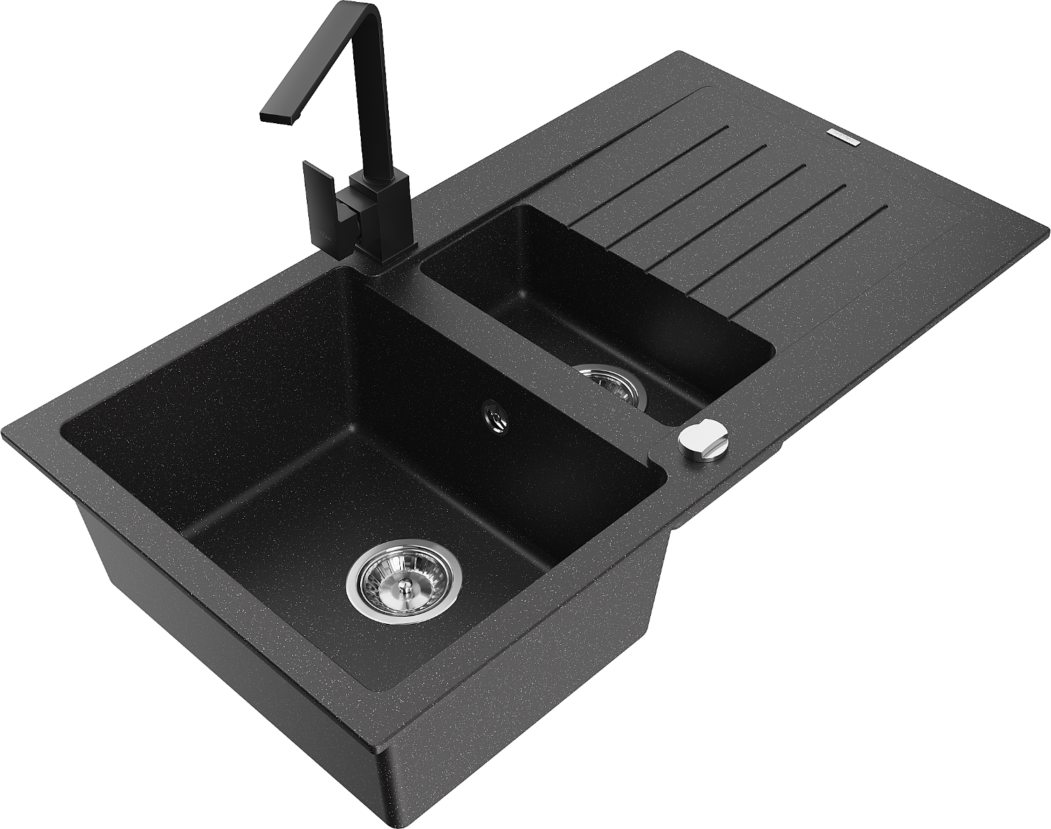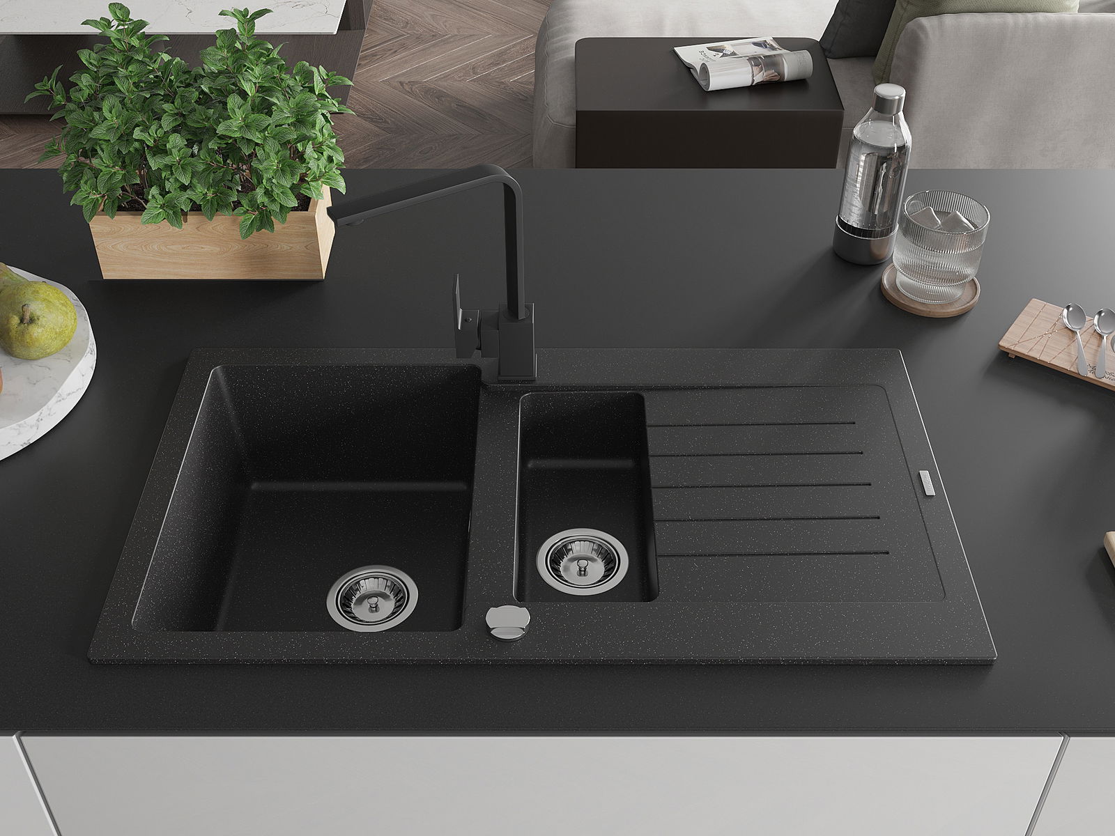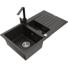 Mexen Matias évier en granit 1,5 cuves avec égouttoir et robinet de cuisine Rita, noir/métallique argent - 6502-73-670300-70