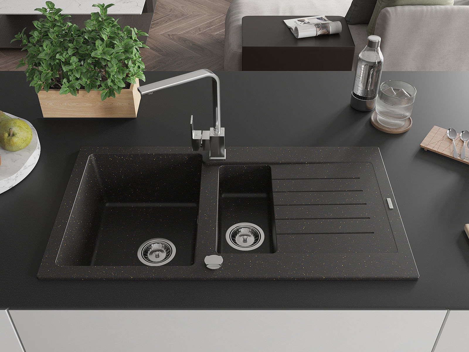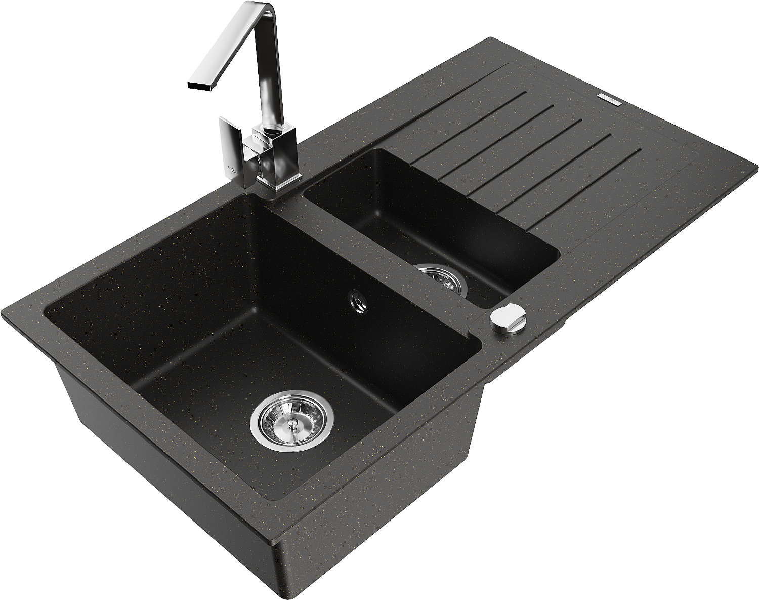 Mexen Matias évier en granit 1,5 bac avec égouttoir et mitigeur de cuisine Rita, noir/or - 6502-75-670300-00