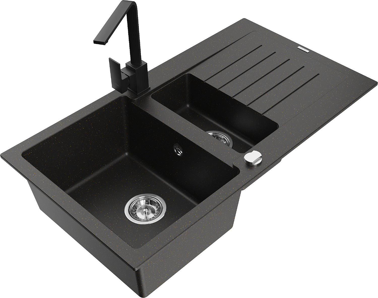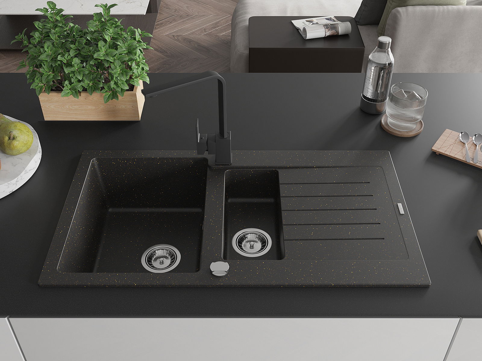 Mexen Matias évier en granit 1,5 bac avec égouttoir et robinet de cuisine Rita, noir/or - 6502-75-670300-70