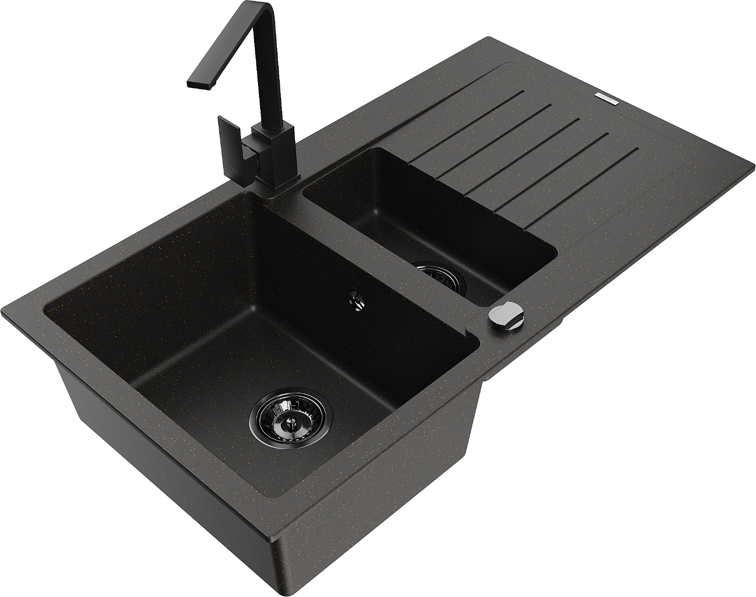 Mexen Matias évier en granit à 1,5 bac avec égouttoir et robinet de cuisine Rita, noir/doré - 6502-75-670300-70-B