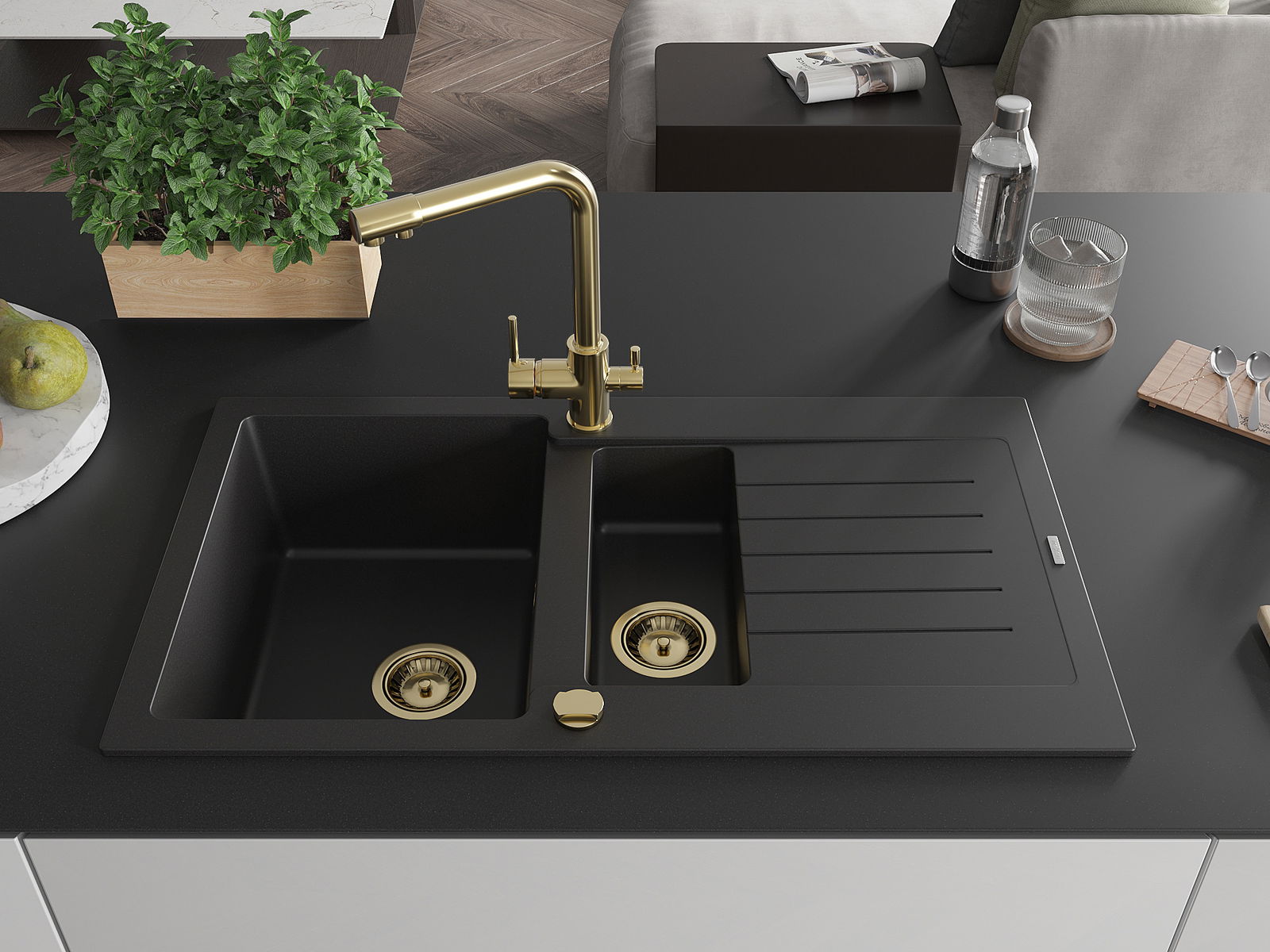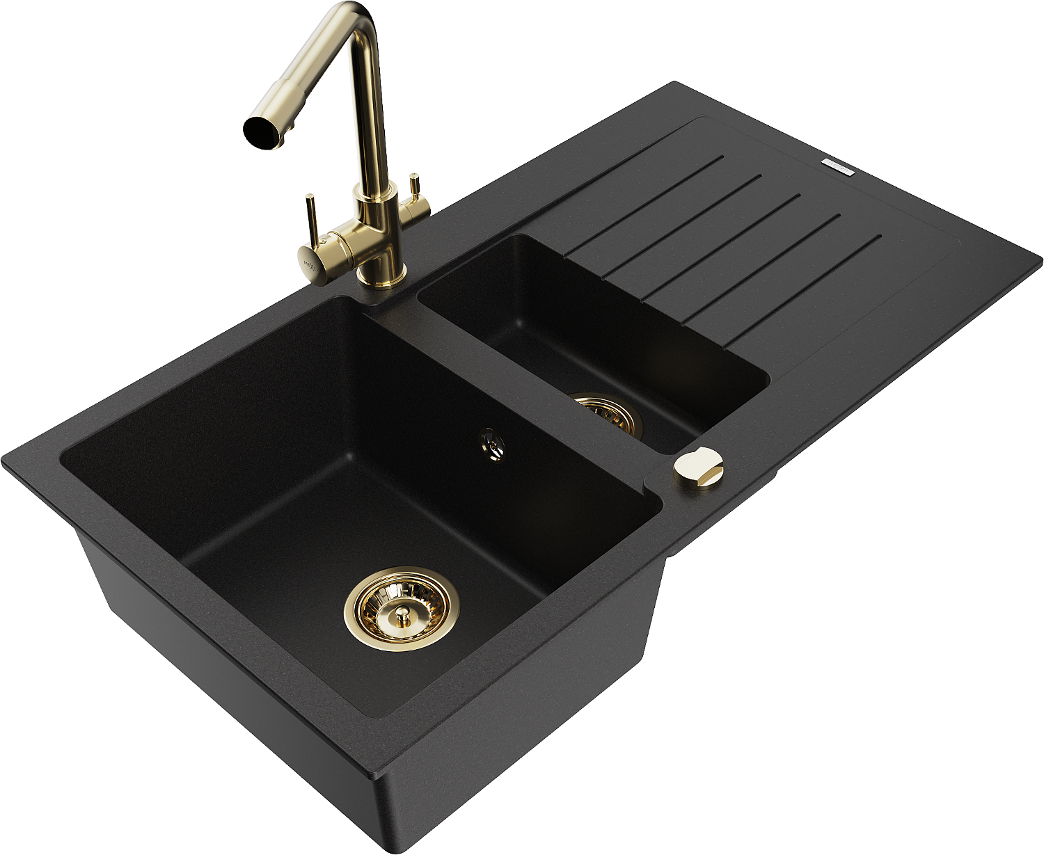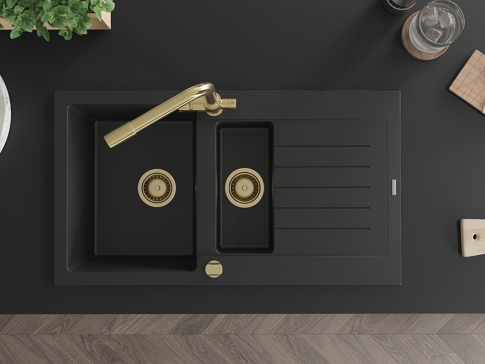 Mexen Matias évier en granit 1,5 bac avec égouttoir et robinet de cuisine Duero, noir - 6502-77-671600-50