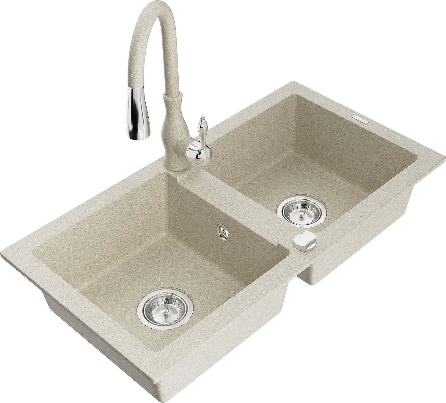 Mexen Mario évier en granit double cuve avec robinet de cuisine Savita, beige - 6504-69-672601-69