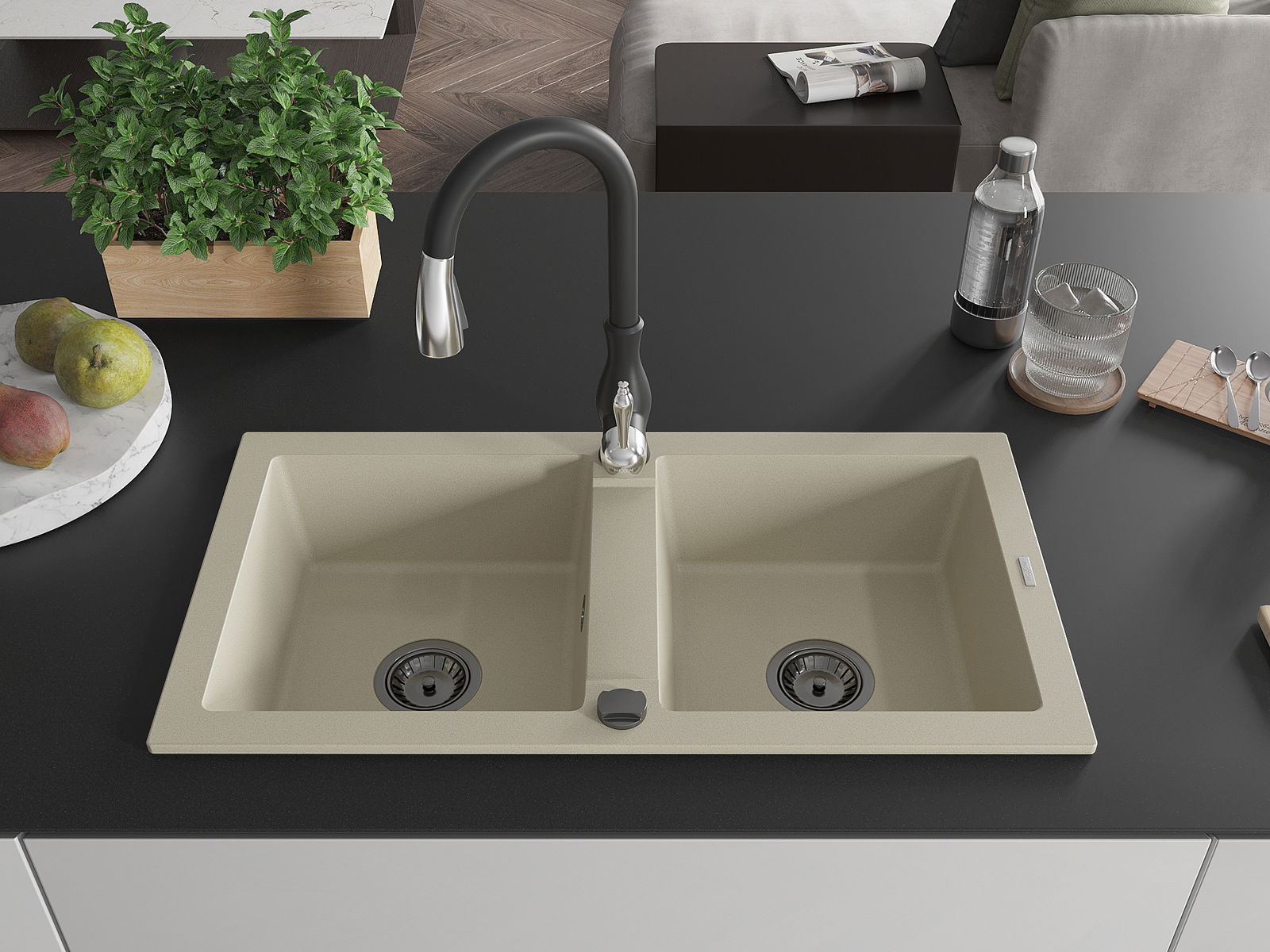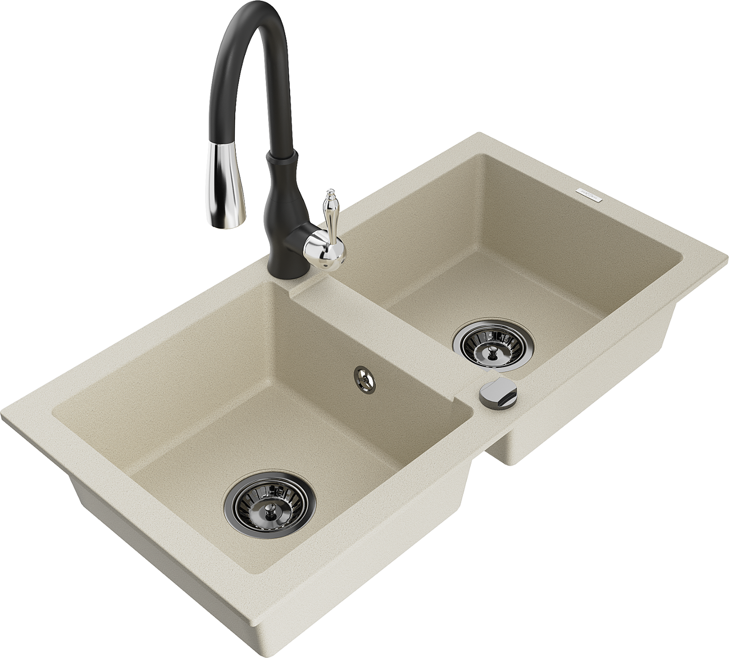 Mexen Mario évier granit 2 bacs avec robinet de cuisine Savita, beige - 6504-69-672601-70