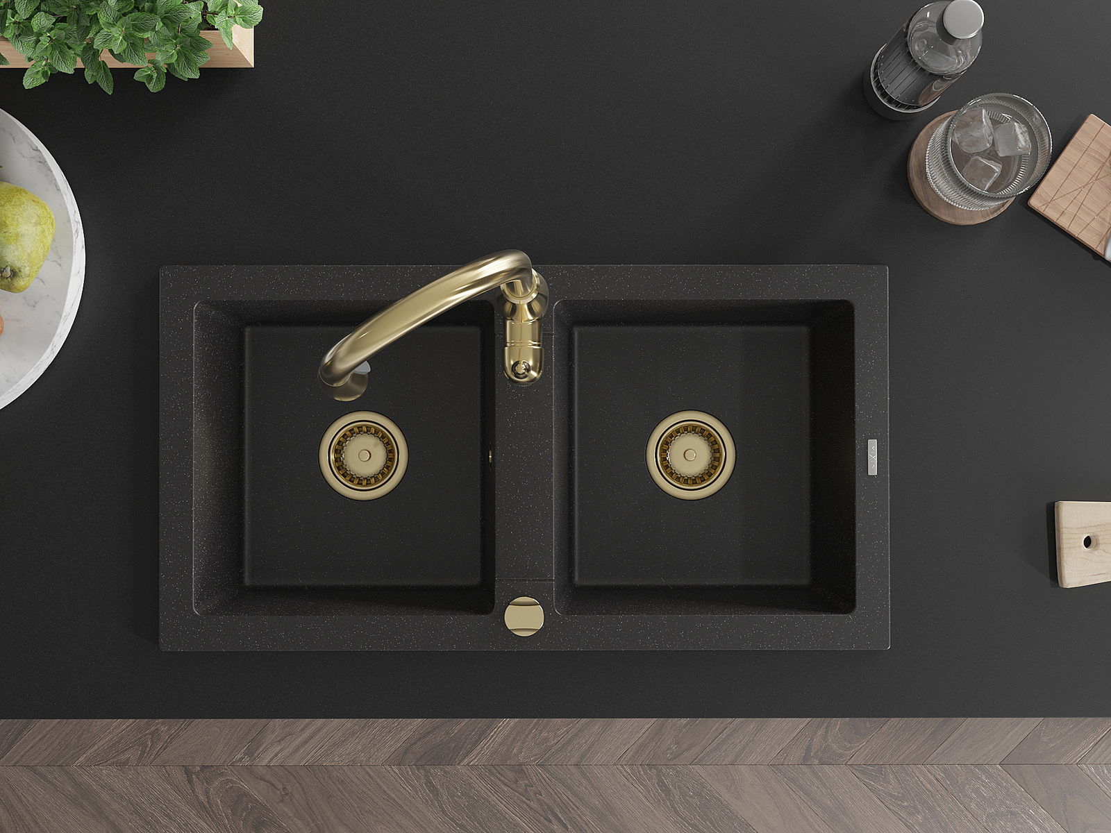 Mexen Mario évier de cuisine en granit à 2 bacs avec robinet de cuisine Savita, noir/argent métallisé - 6504-73-672601-50