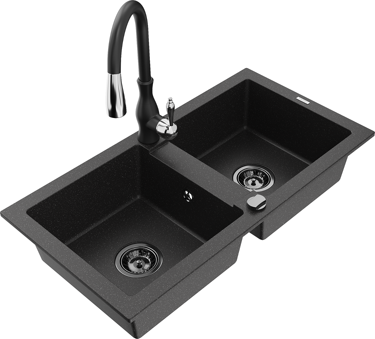 Mexen Mario évier en granit à 2 cuves avec robinet de cuisine Savita, noir/argent métallisé - 6504-73-672601-70-B