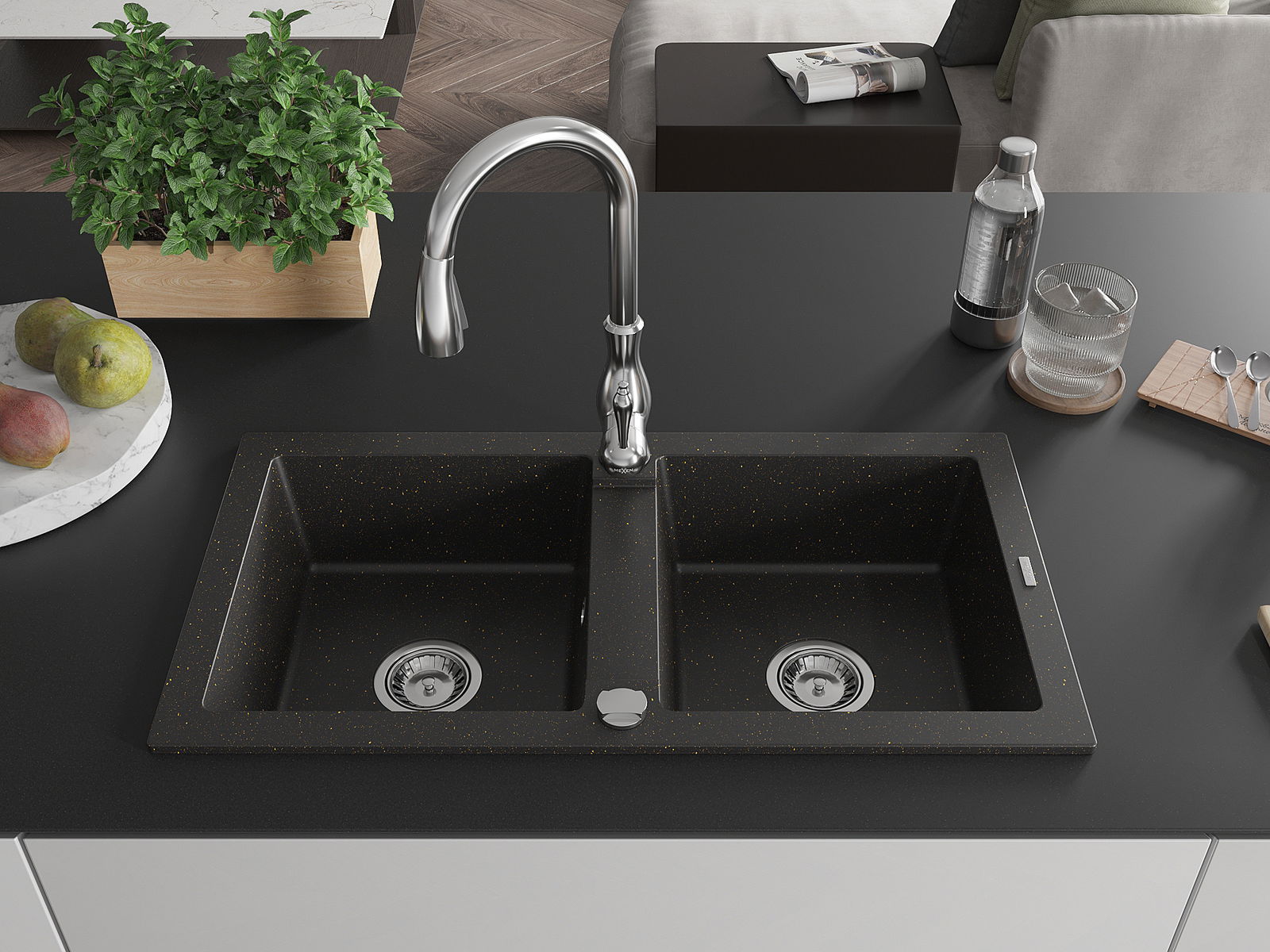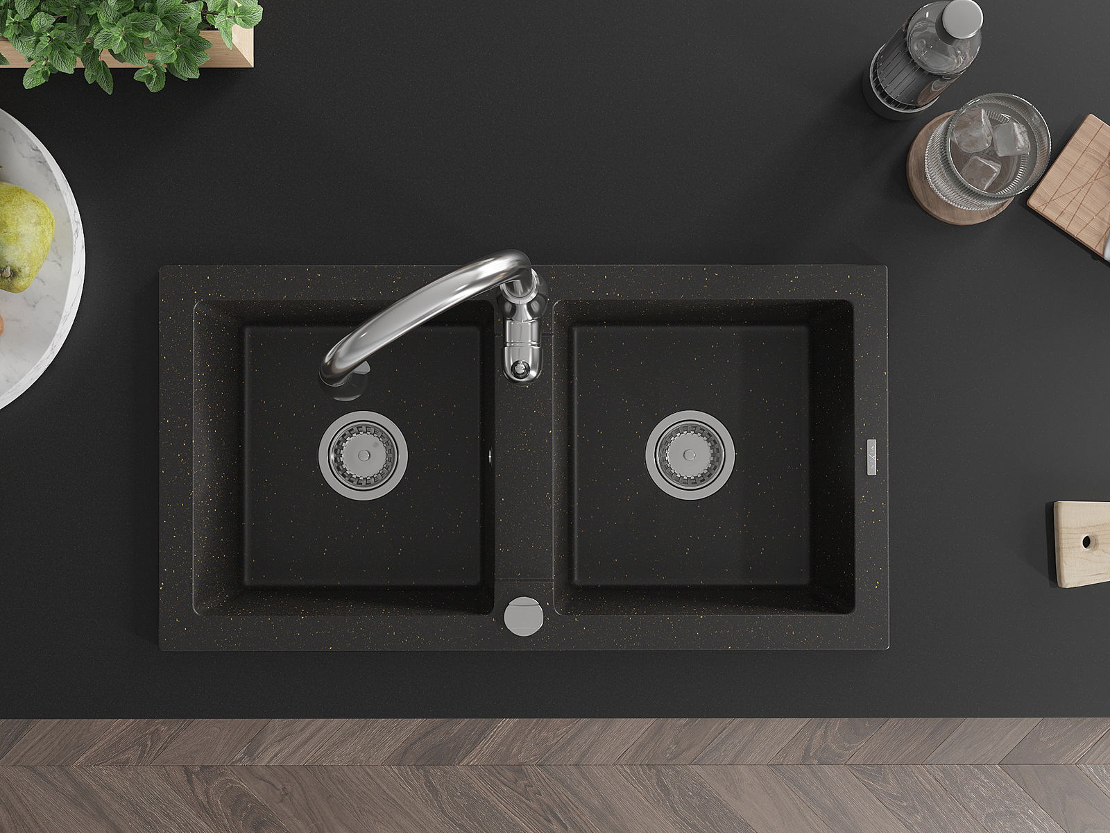 Mexen Mario évier en granit à 2 bacs avec robinet de cuisine Savita, noir/métallisé doré - 6504-75-672601-00