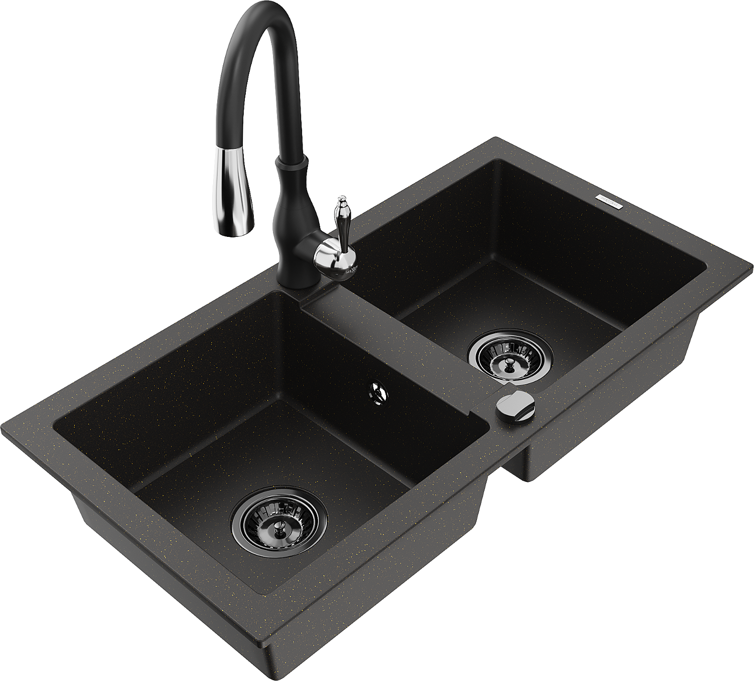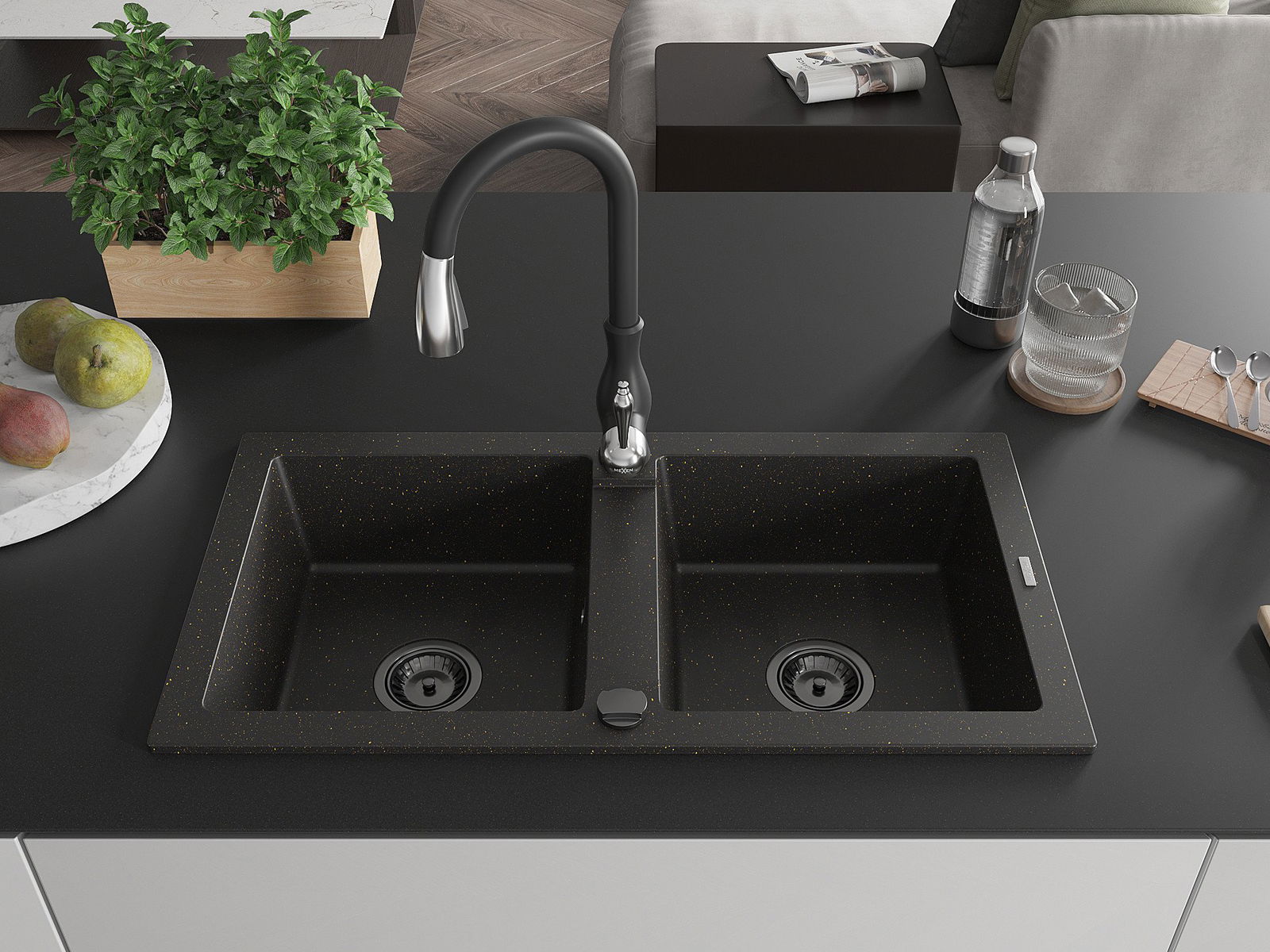 Mexen Mario évier en granit 2 bacs avec robinet de cuisine Savita, noir/or métallisé - 6504-75-672601-70-B