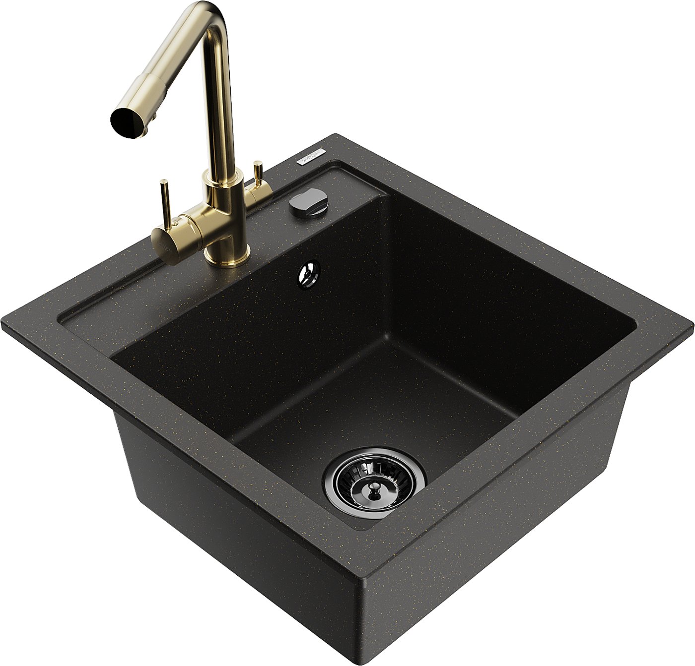 Mexen Vito évier en granit à 1 cuve avec robinet de cuisine Duero, noir/doré métallique - 6503-75-671600-50-B
