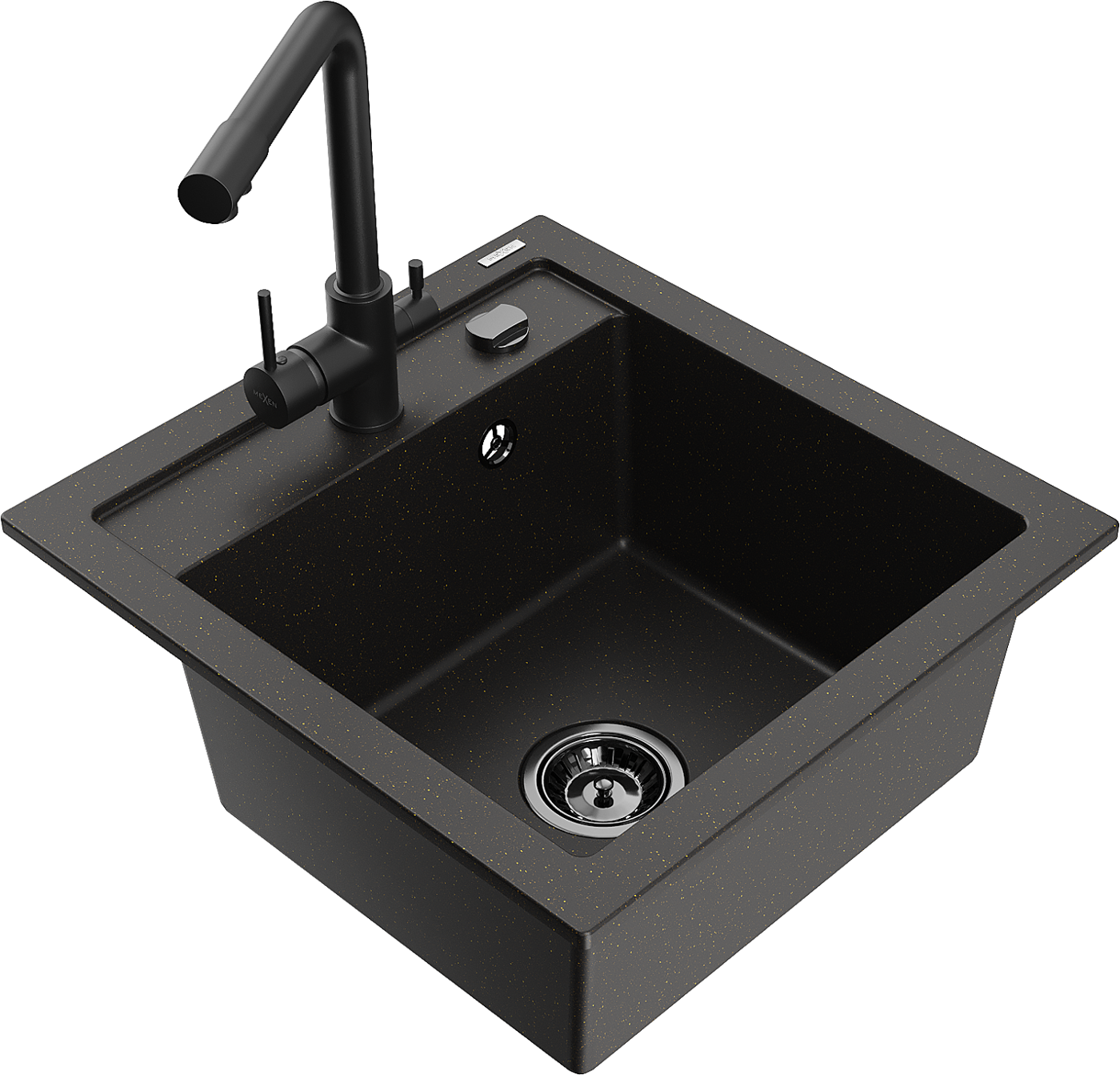 Mexen Vito évier en granit 1 compartiment avec robinet de cuisine Duero, noir/doré métallisé - 6503-75-671600-70-B