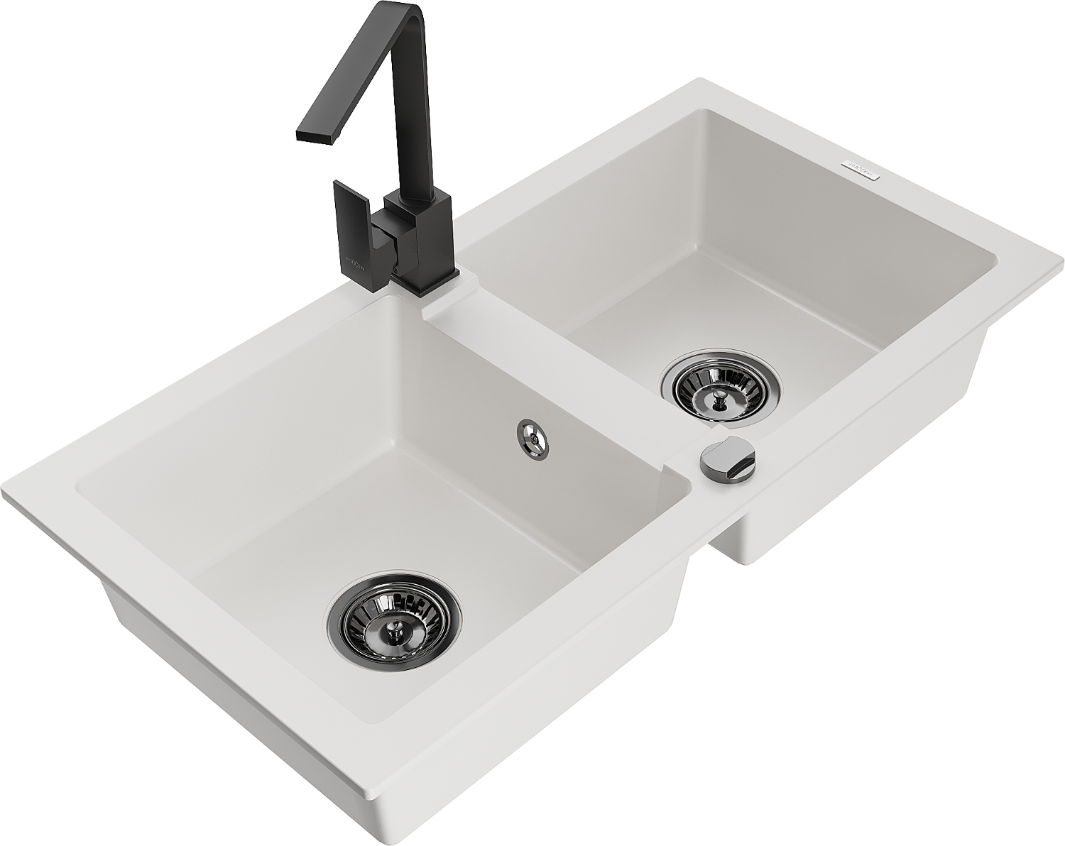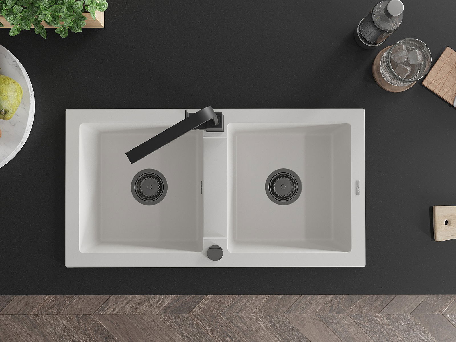 Mexen Mario évier en granit à 2 bacs avec robinet de cuisine Rita, blanc - 6504-20-670300-70