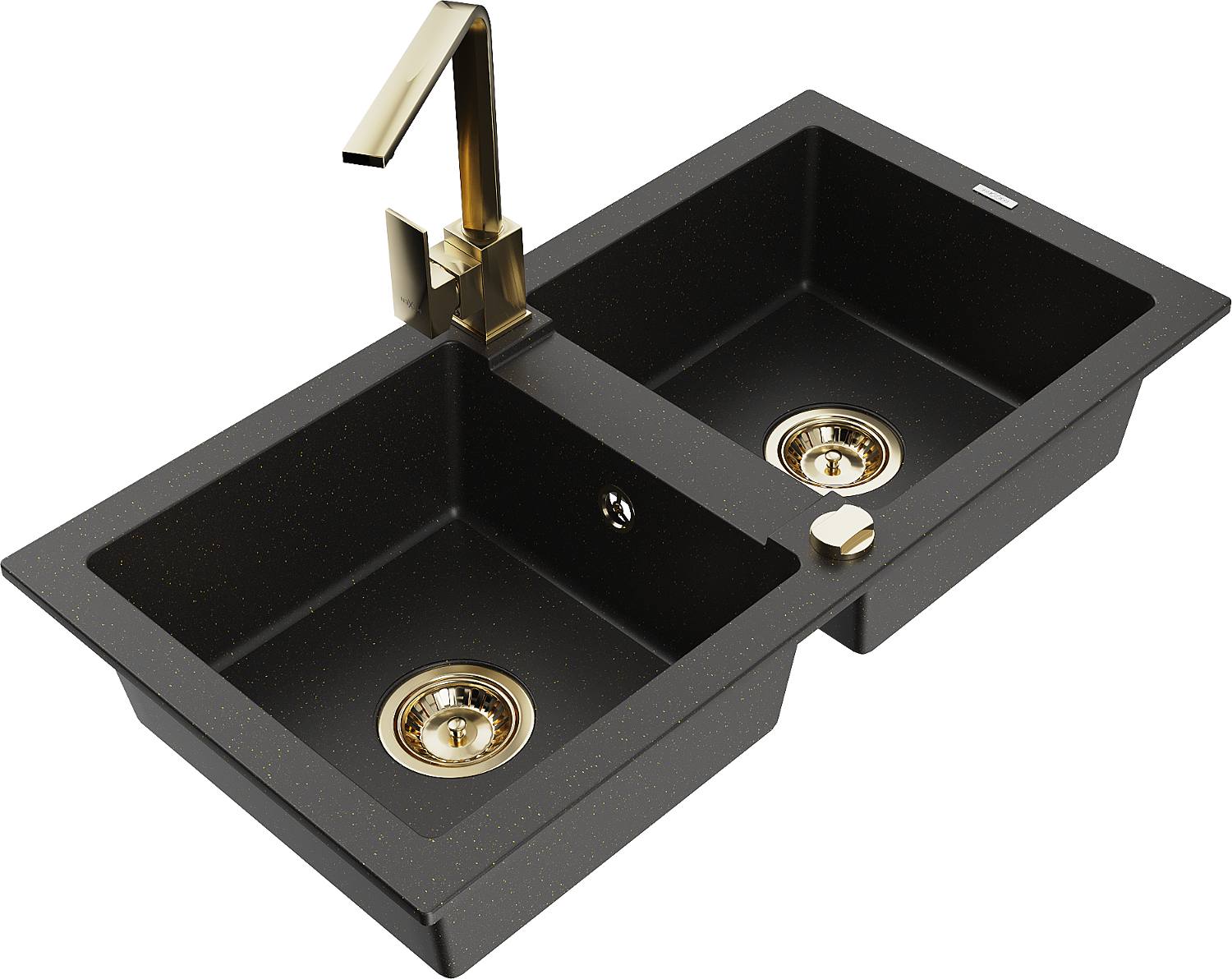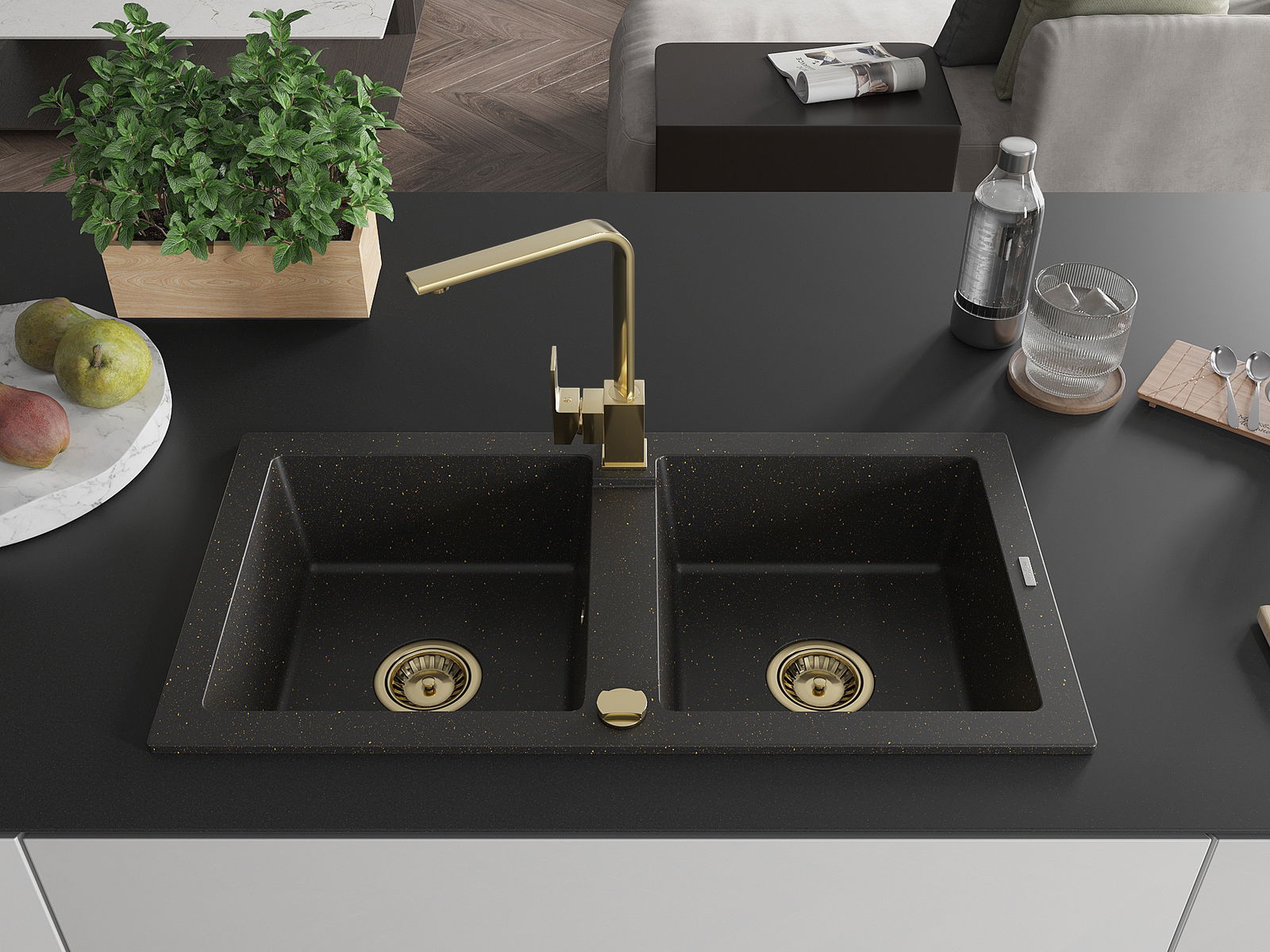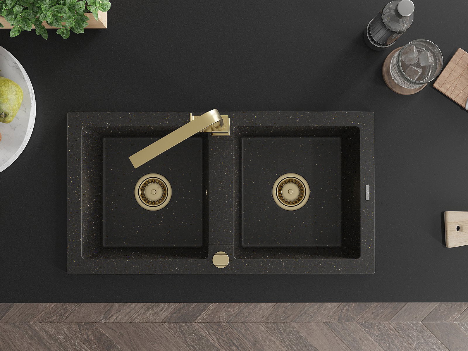 Mexen Mario évier en granit à 2 bacs avec robinet de cuisine Rita, noir/or métallique - 6504-75-670300-50