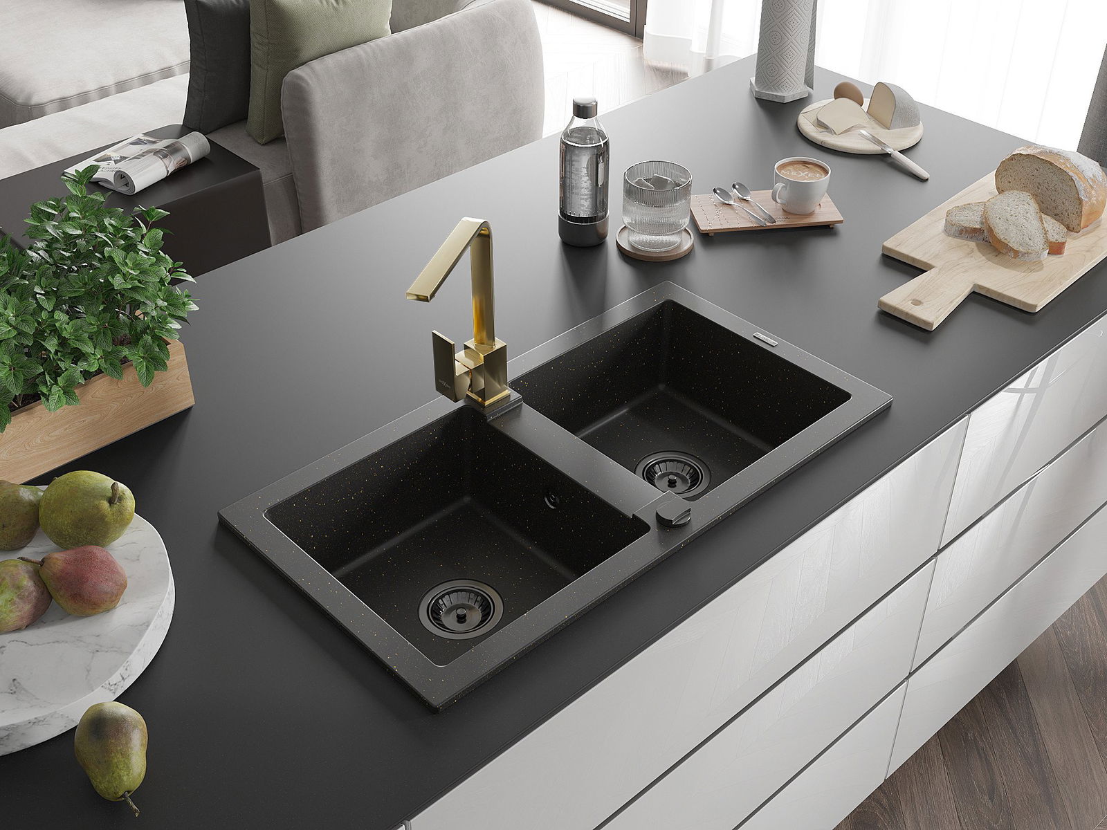 Mexen Mario évier en granit à 2 bacs avec mitigeur de cuisine Rita, noir/doré métallisé - 6504-75-670300-50-B