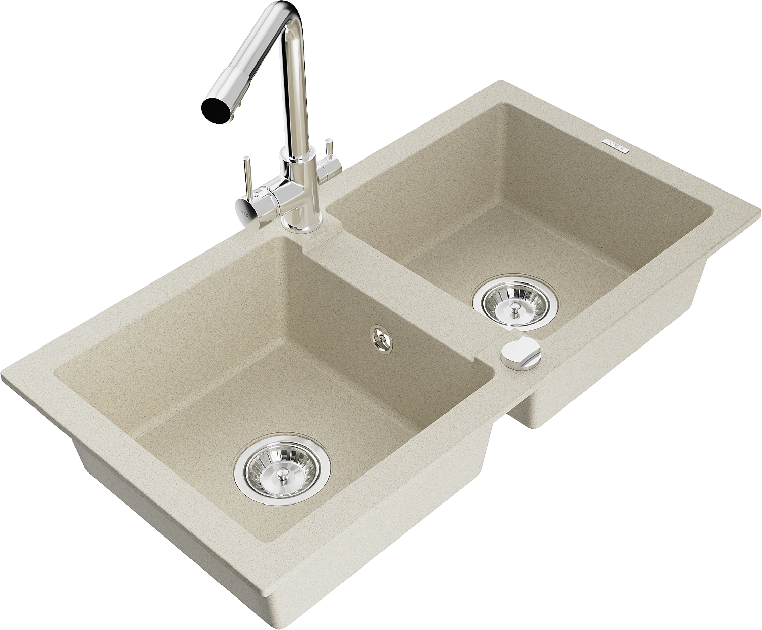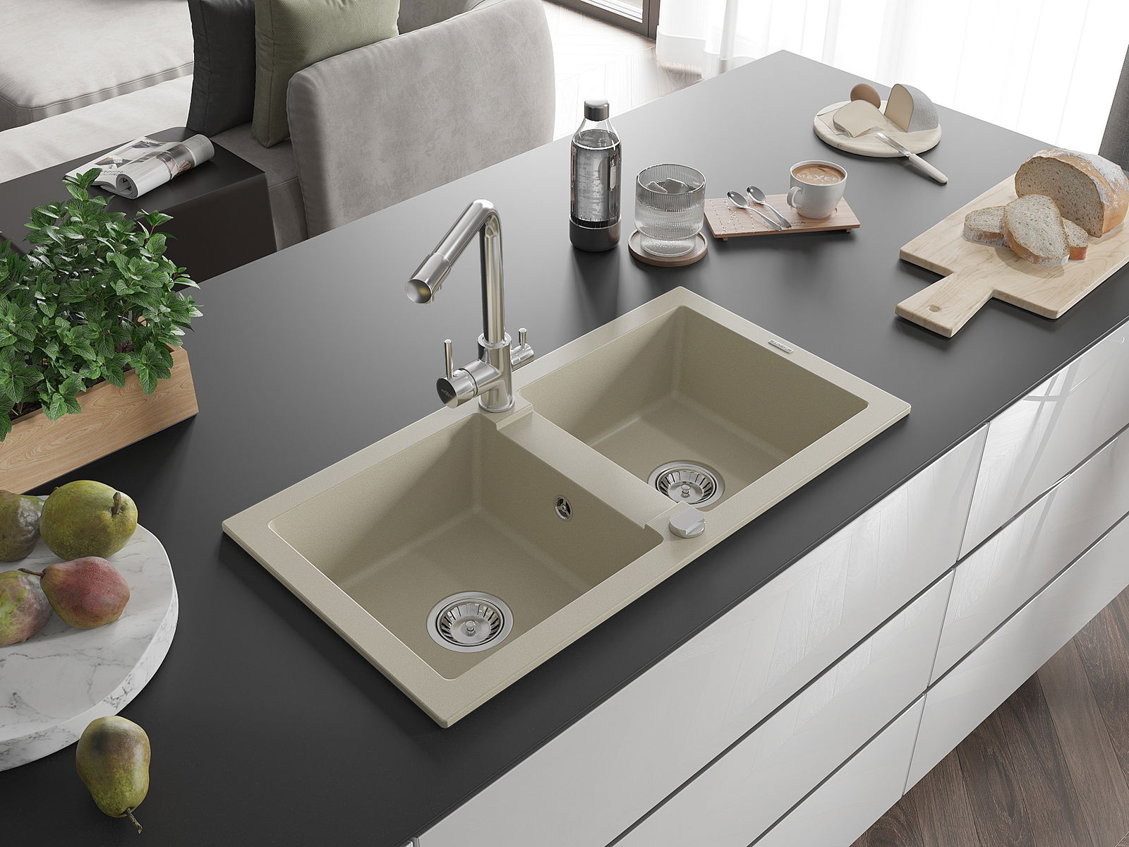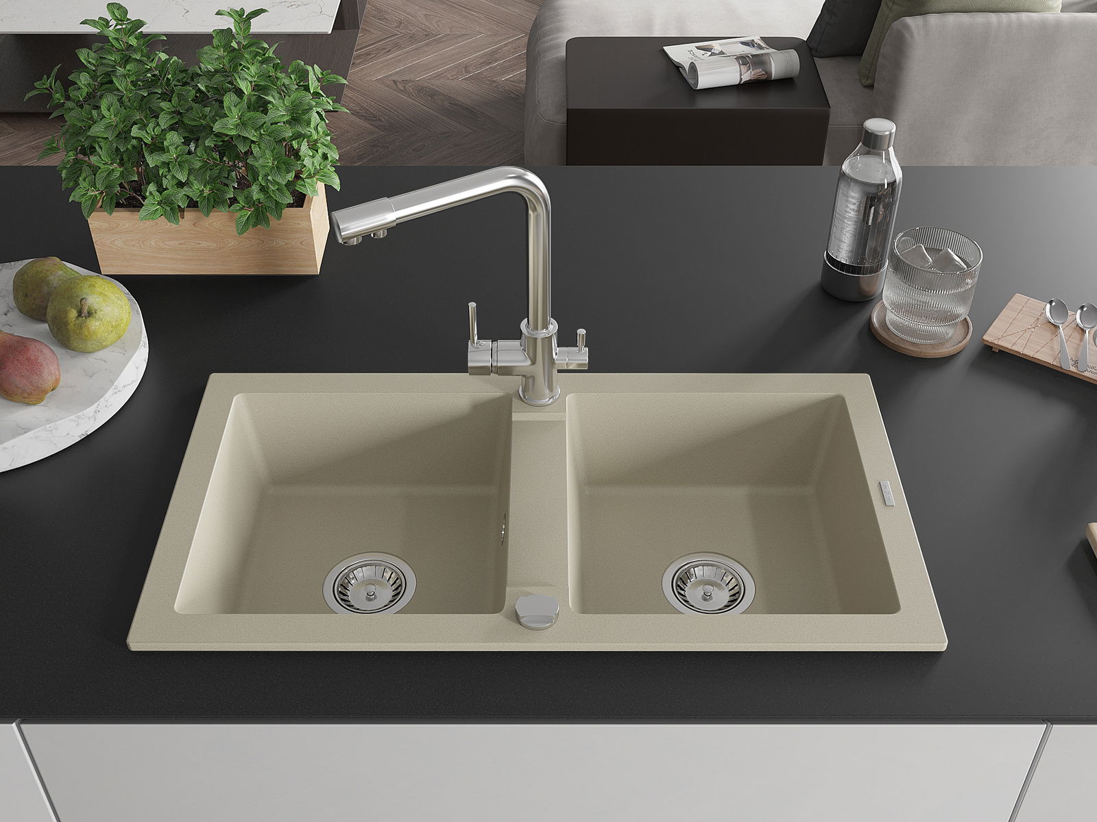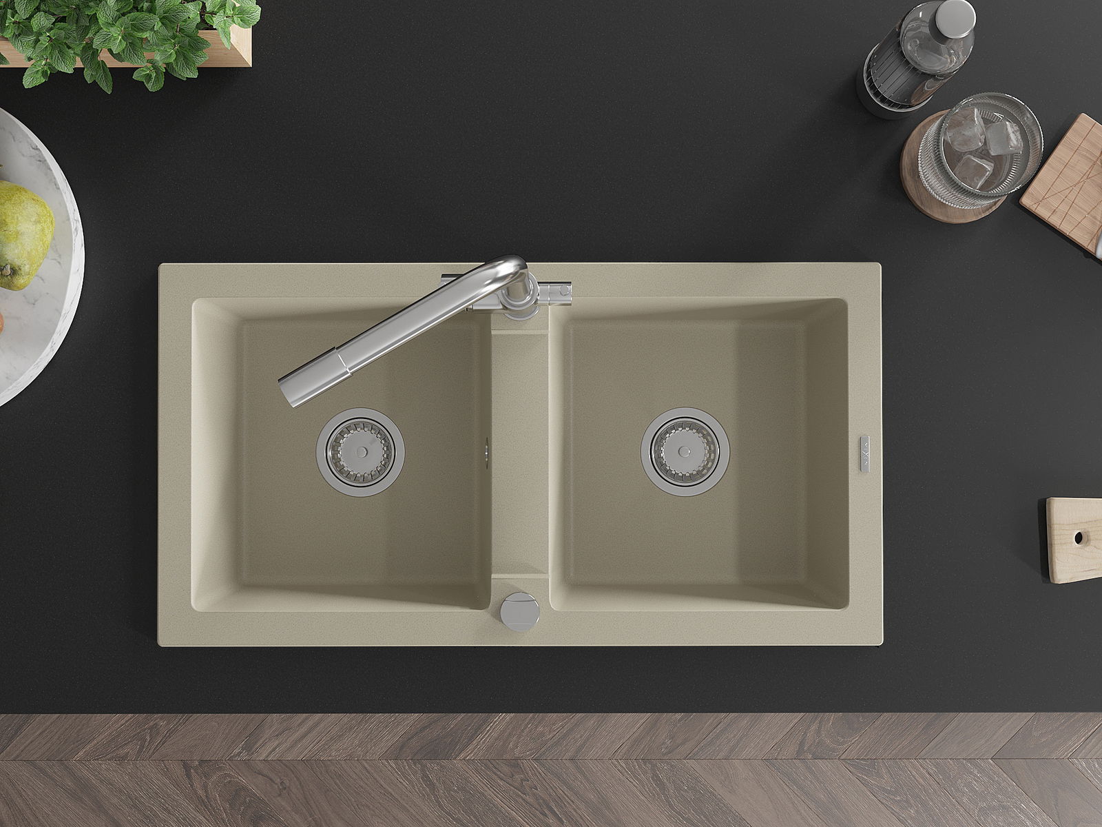 Mexen Mario évier en granit à 2 cuves avec robinet de cuisine Duero, beige - 6504-69-671600-00