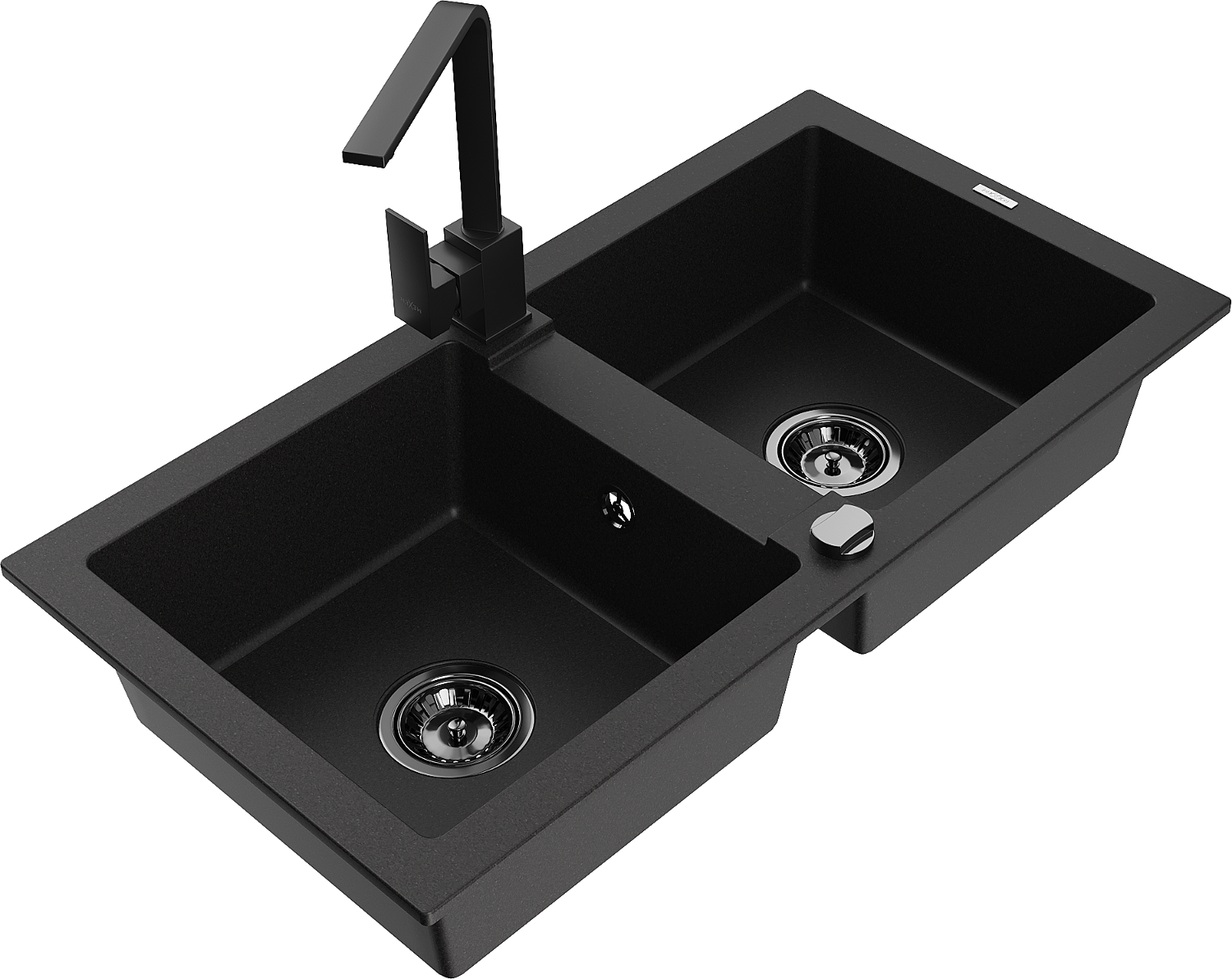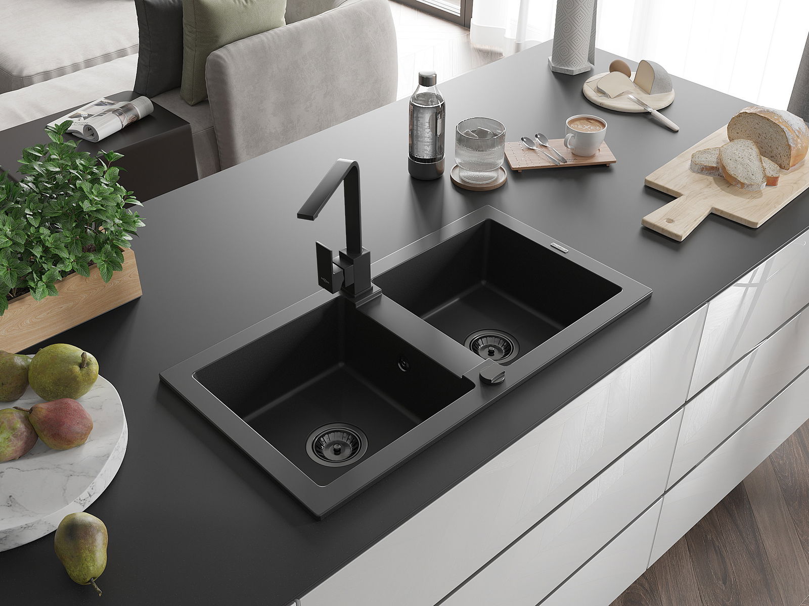 Mexen Mario évier en granit à 2 bacs avec robinet de cuisine Rita, noir - 6504-77-670300-70-B