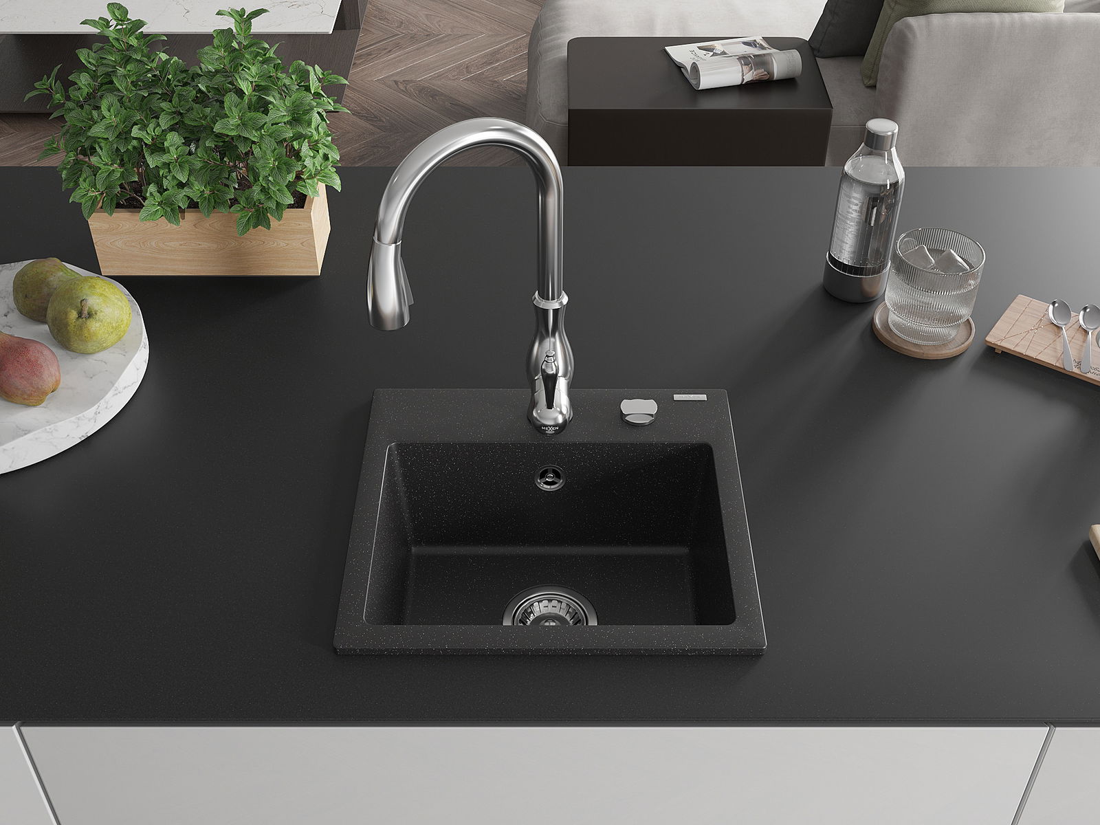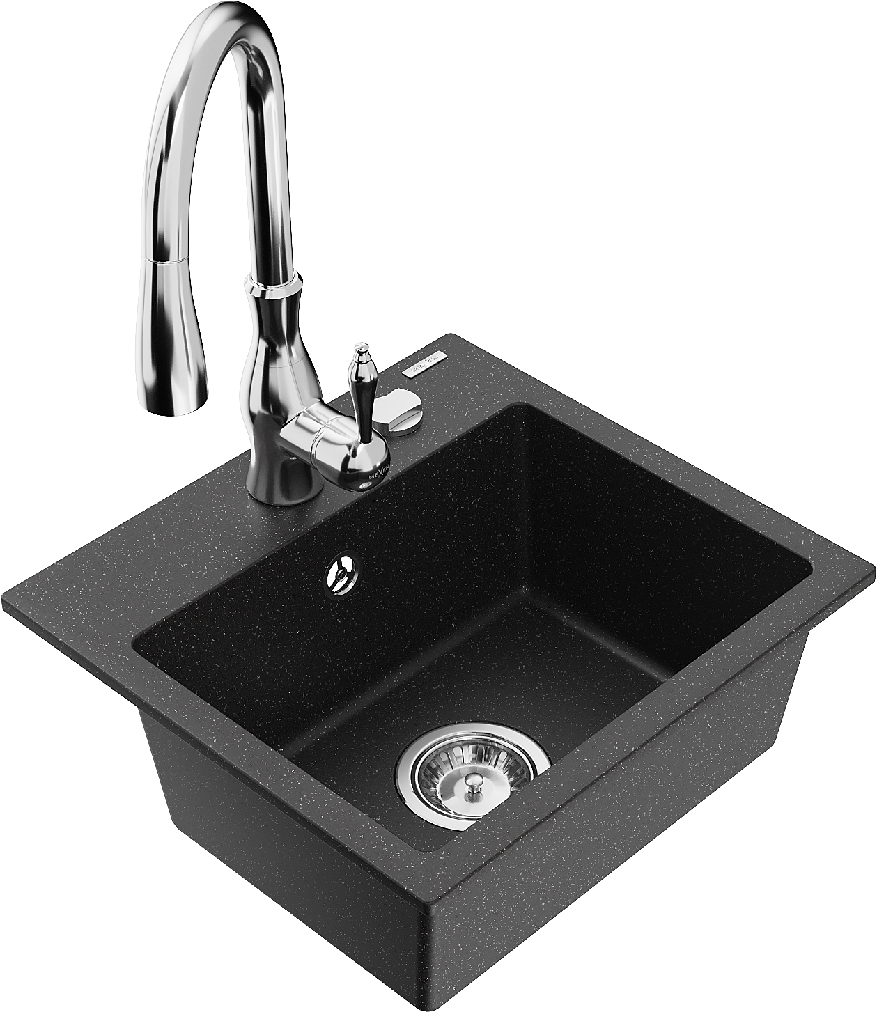 Mexen Milo évier en granit à 1 bac avec robinet de cuisine Savita, noir/argent métallisé- 6505-73-672601-00