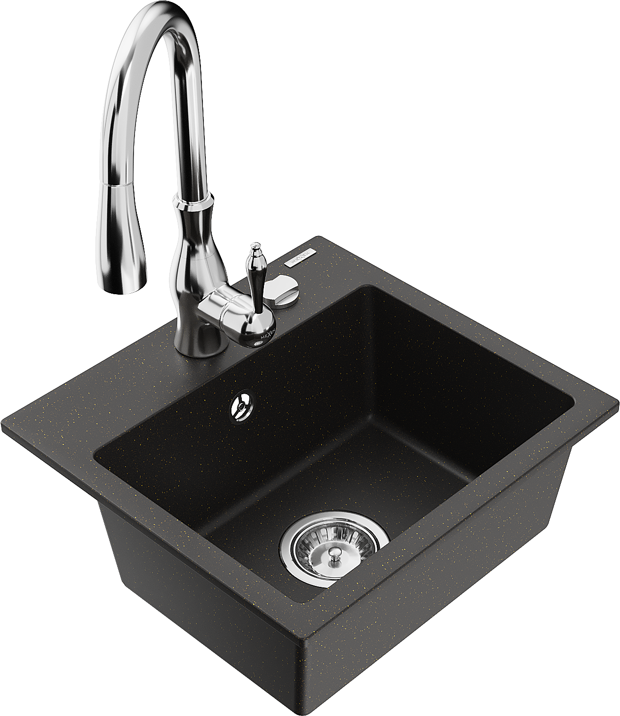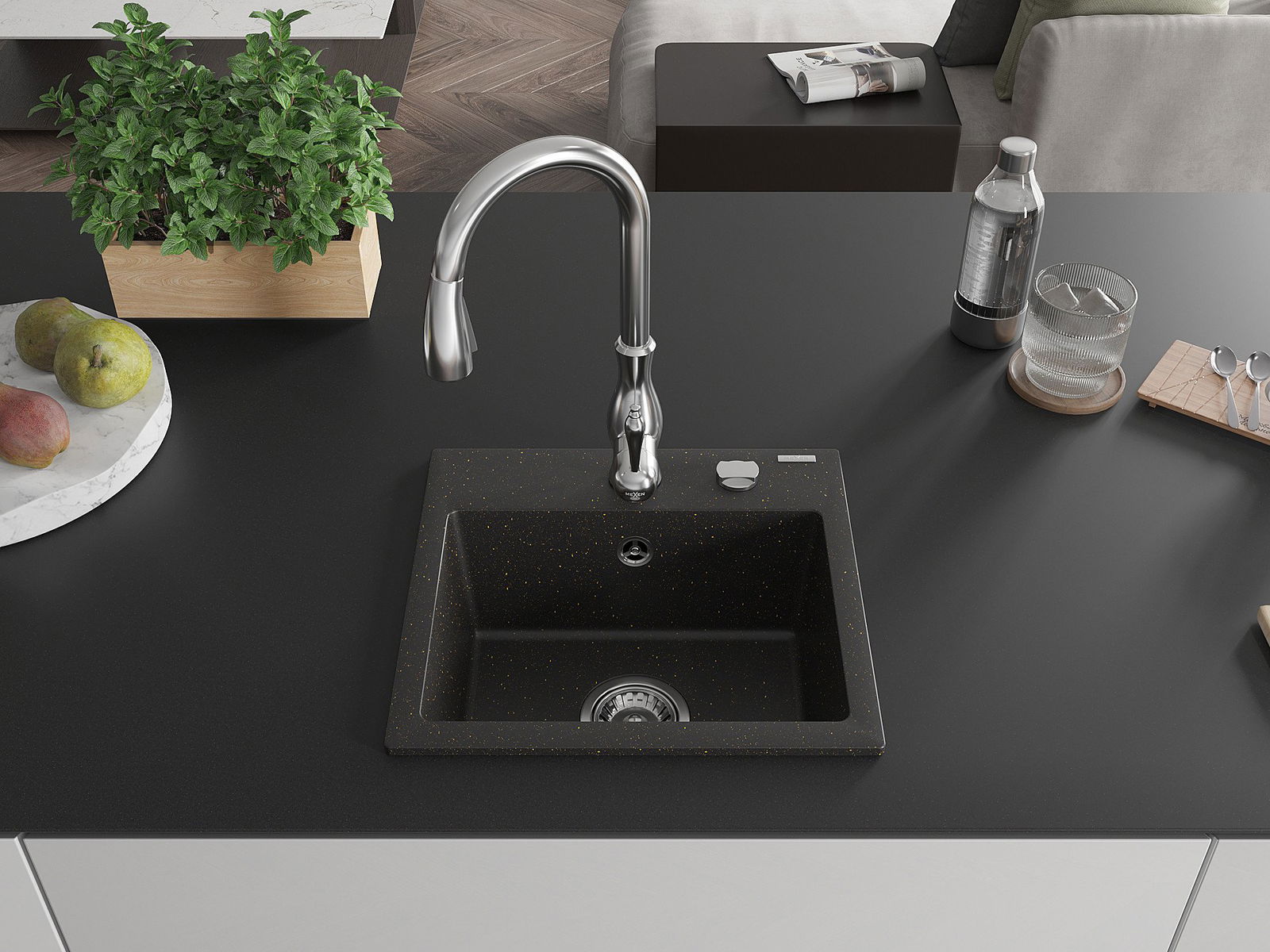 Mexen Milo évier en granit 1 bac avec robinet de cuisine Savita, noir/or métallique- 6505-75-672601-00