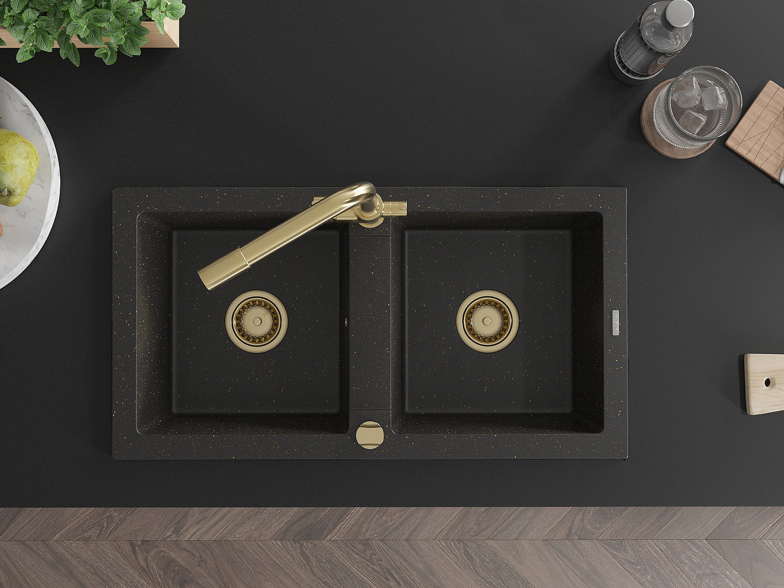 Mexen Mario évier de cuisine en granit à 2 cuves avec robinet de cuisine Duero, noir/doré métallisé - 6504-75-671600-50