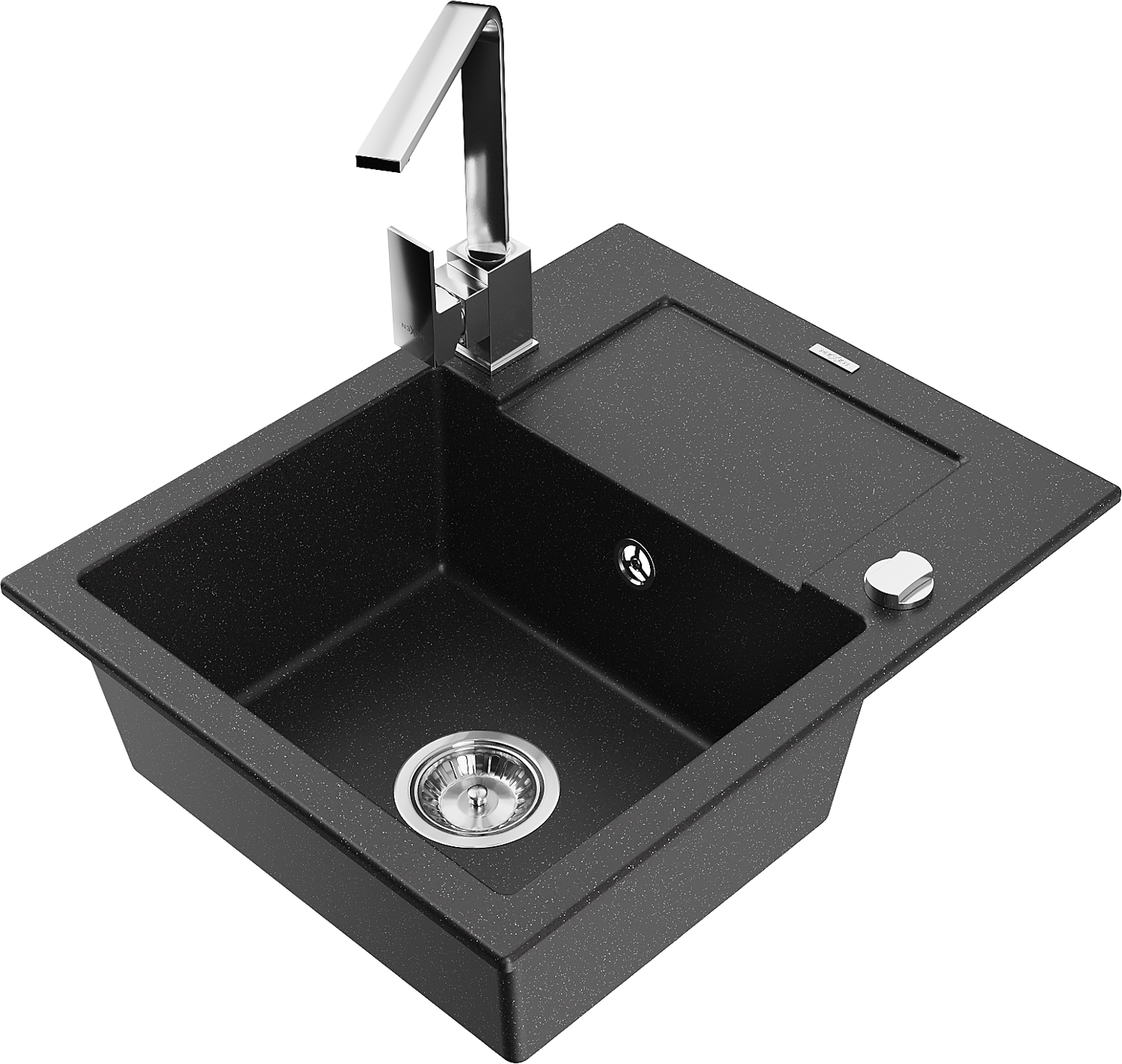 Mexen Enzo évier en granit 1 bac avec égouttoir et mitigeur de cuisine Rita, noir/métallisé argent - 6506-73-670300-00