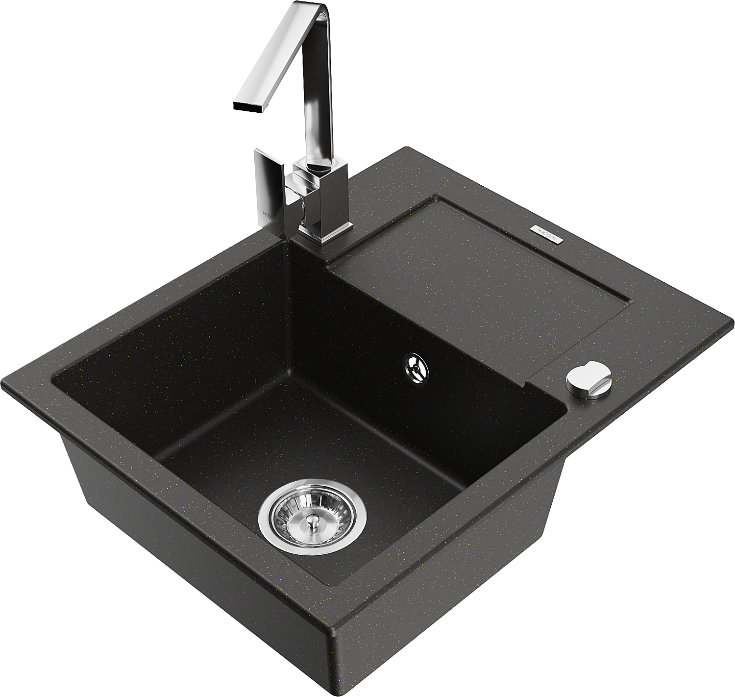 Mexen Enzo évier en granit 1 bac avec égouttoir et robinet de cuisine Rita, noir/doré métallisé - 6506-75-670300-00