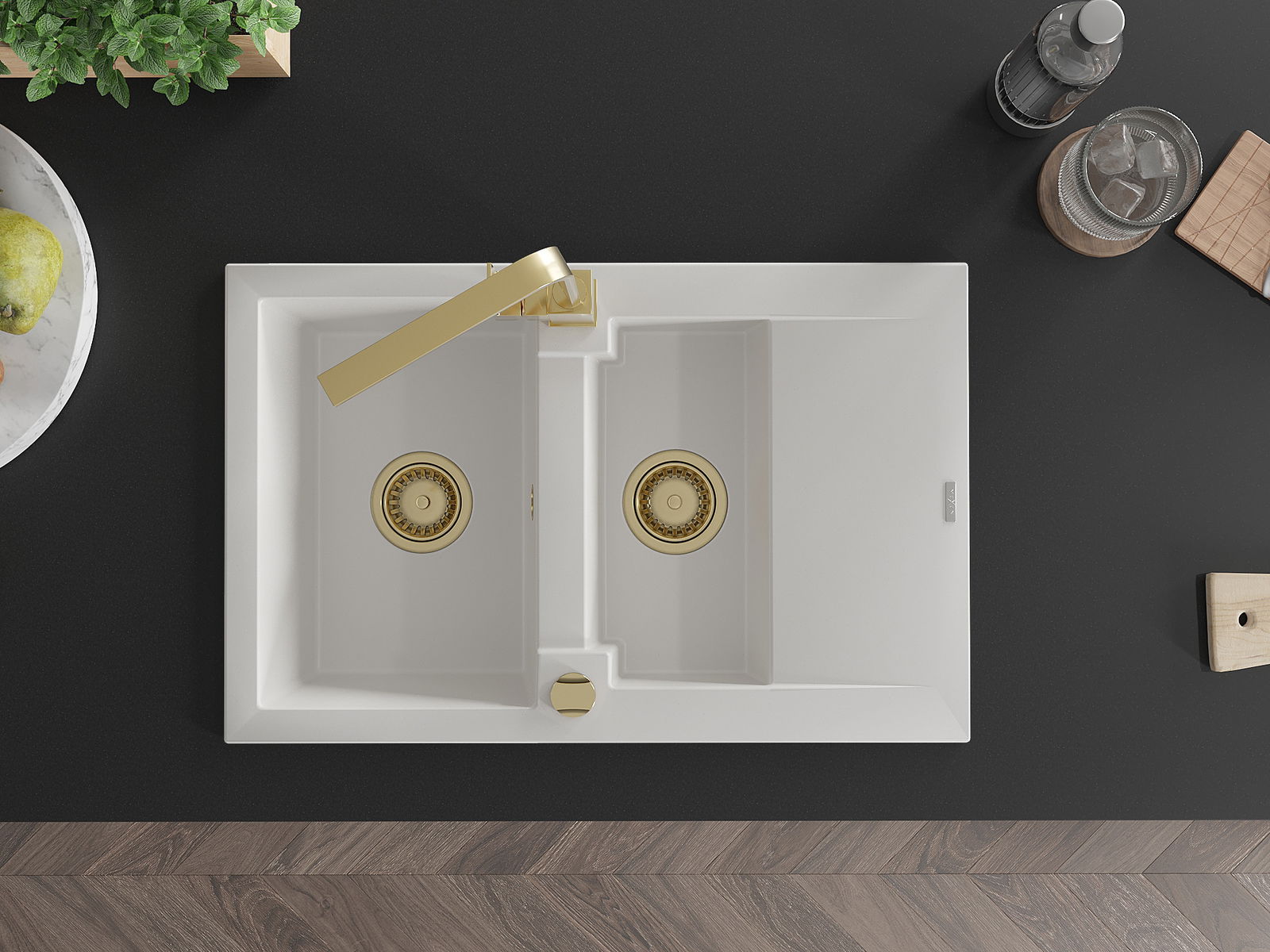 Mexen Gaspar évier en granit 1,5 bacs avec égouttoir et robinet de cuisine Rita, blanc - 6507-20-670300-50