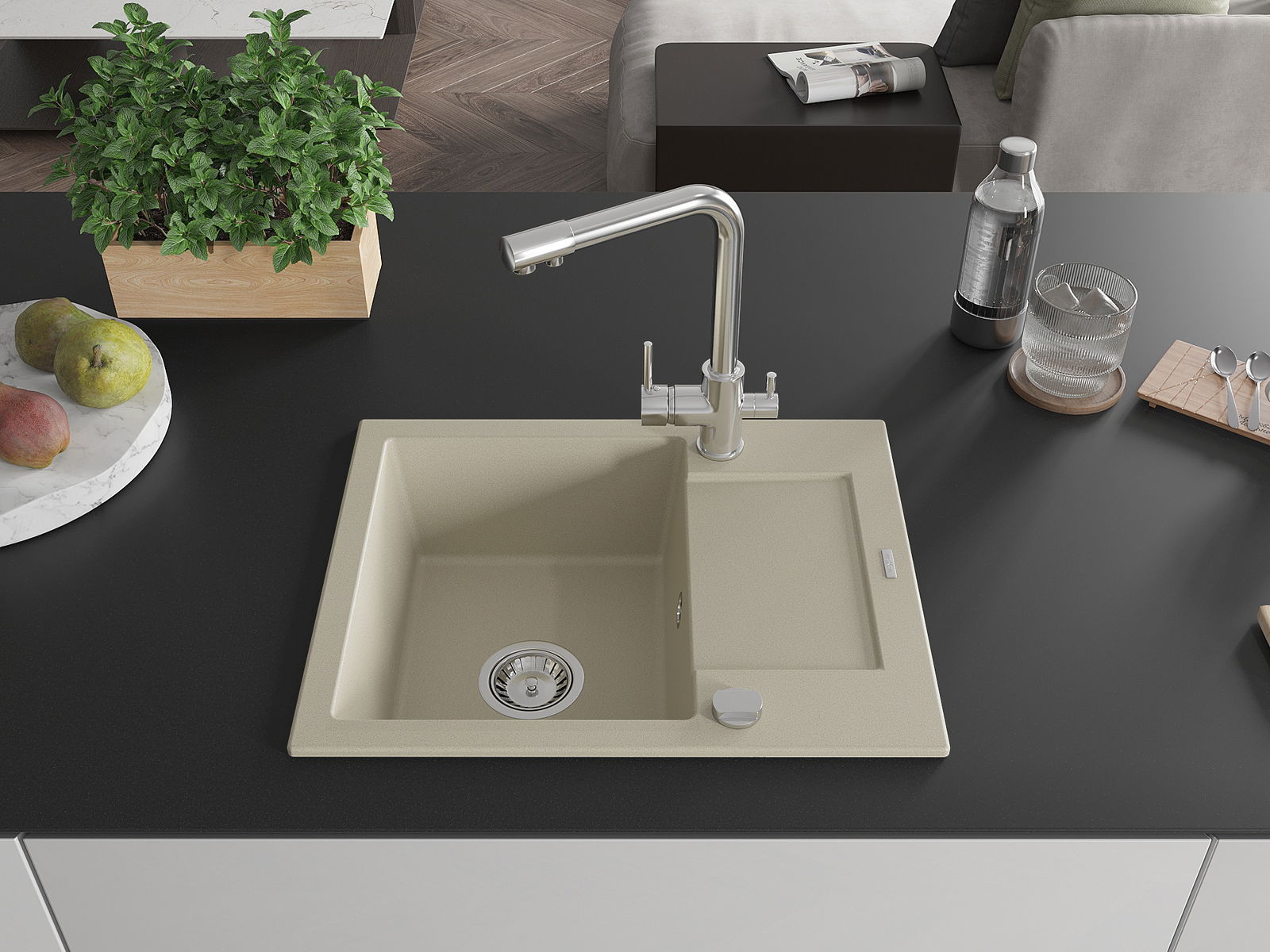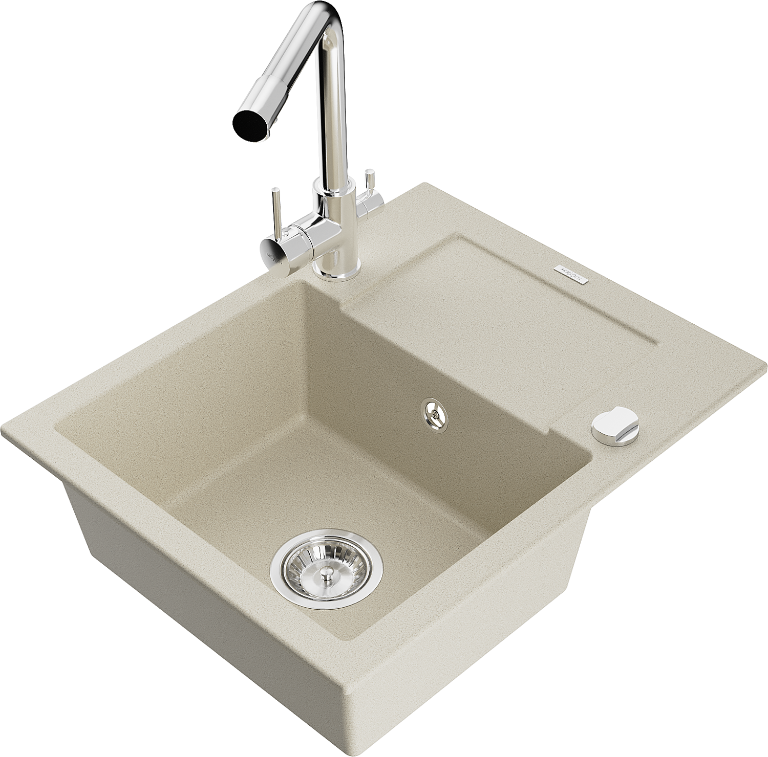 Mexen Enzo évier en granit 1 bac avec égouttoir et robinet de cuisine Duero, beige - 6506-69-671600-00