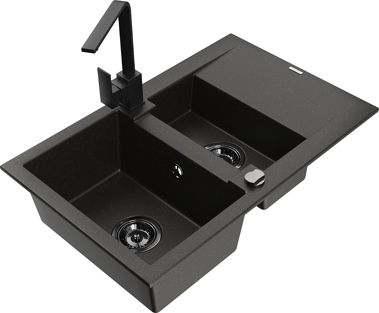 Mexen Gaspar évier en granit 1,5 bac avec égouttoir et mitigeur de cuisine Rita, noir/or - 6507-75-670300-70-B