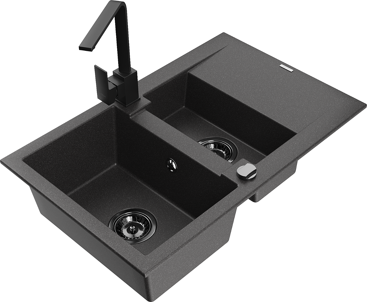 Mexen Gaspar évier en granit 1,5 bac avec égouttoir et robinet de cuisine Rita, noir moucheté - 6507-76-670300-70-B