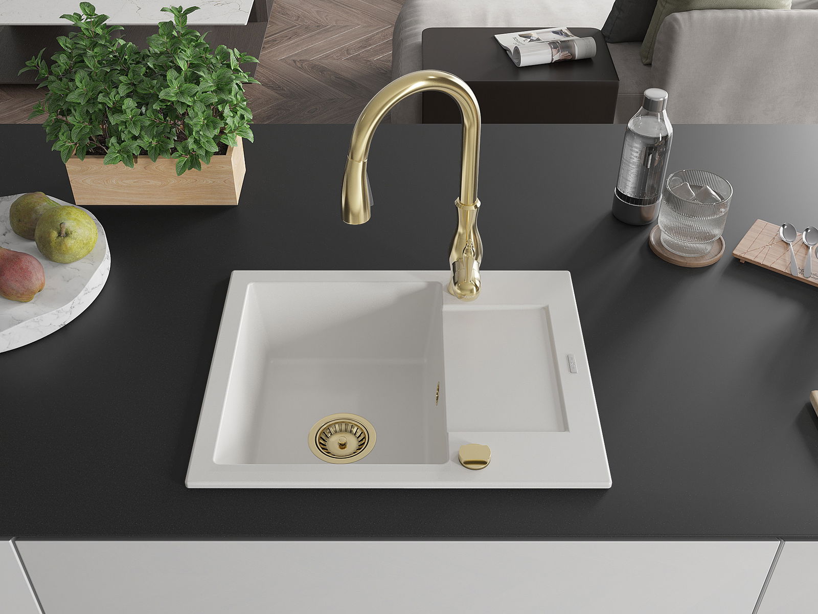 Mexen Enzo évier en granit 1 bac avec égouttoir et mitigeur de cuisine Savita, blanc - 6506-20-672601-50