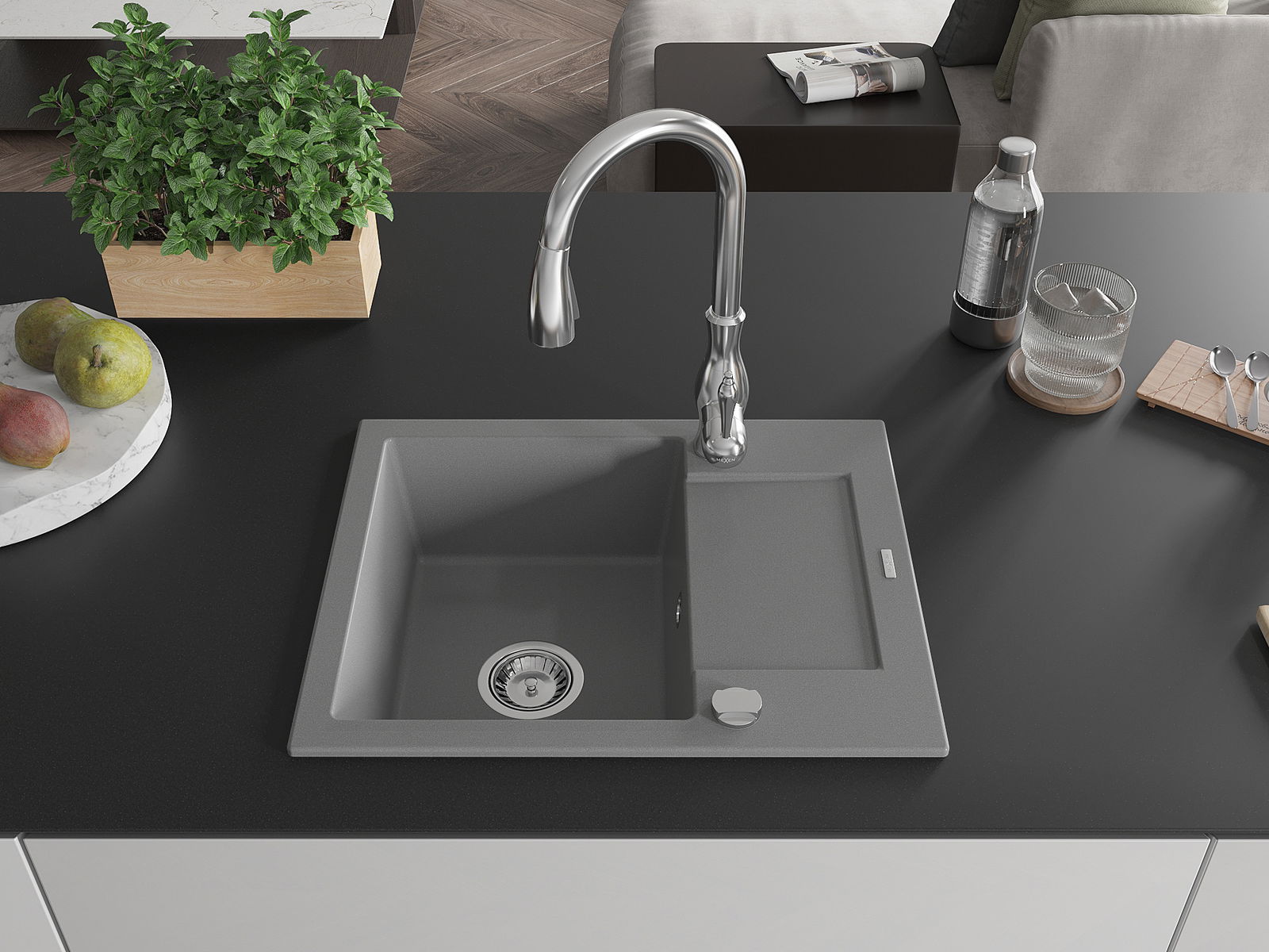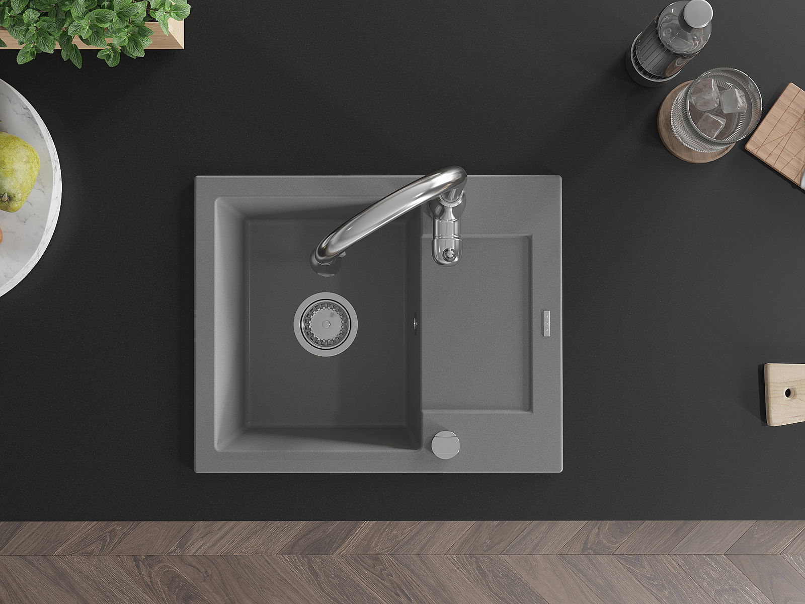 Mexen Enzo évier en granit 1 bac avec égouttoir et robinet de cuisine Savita, gris - 6506-71-672601-00