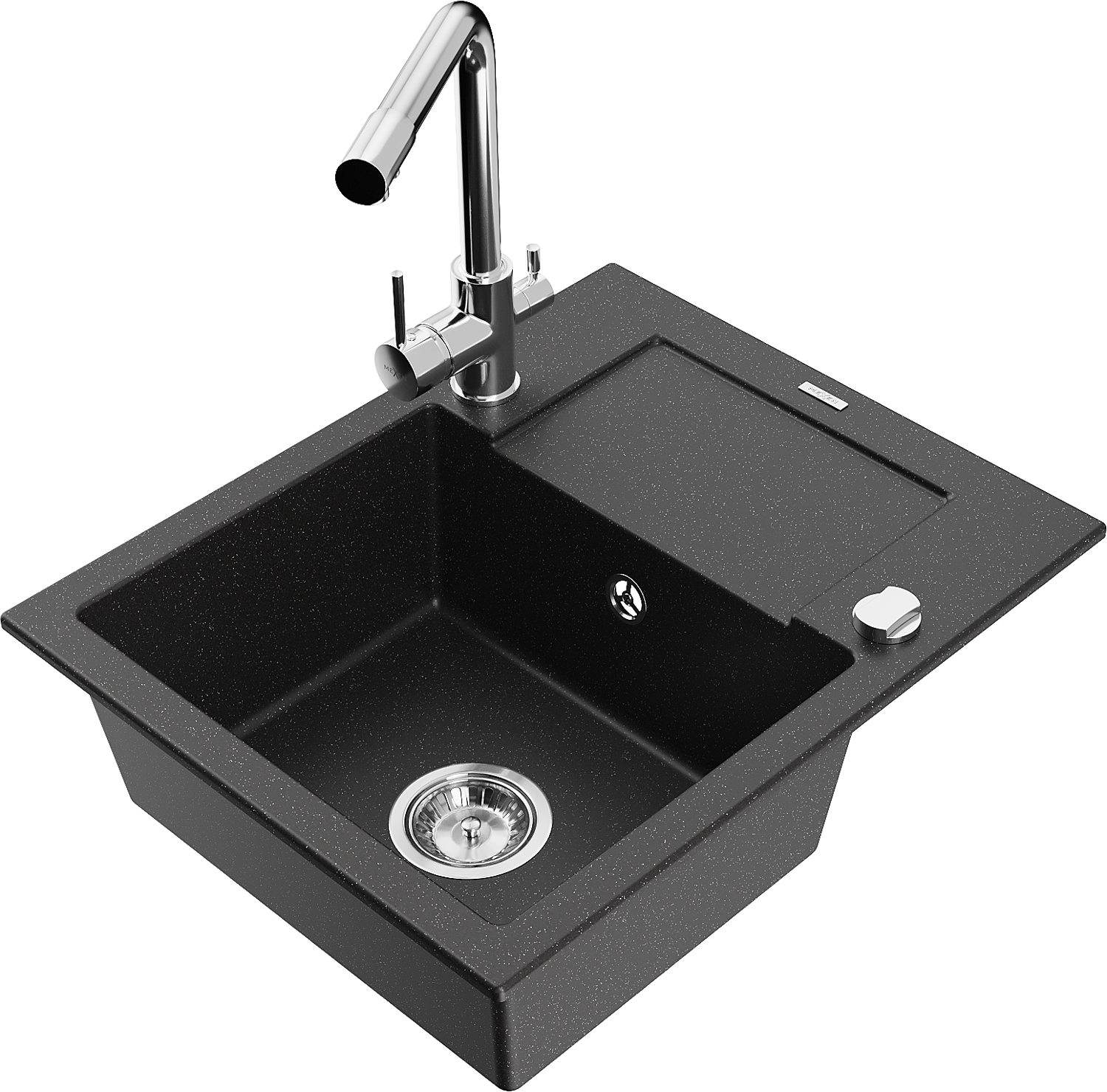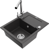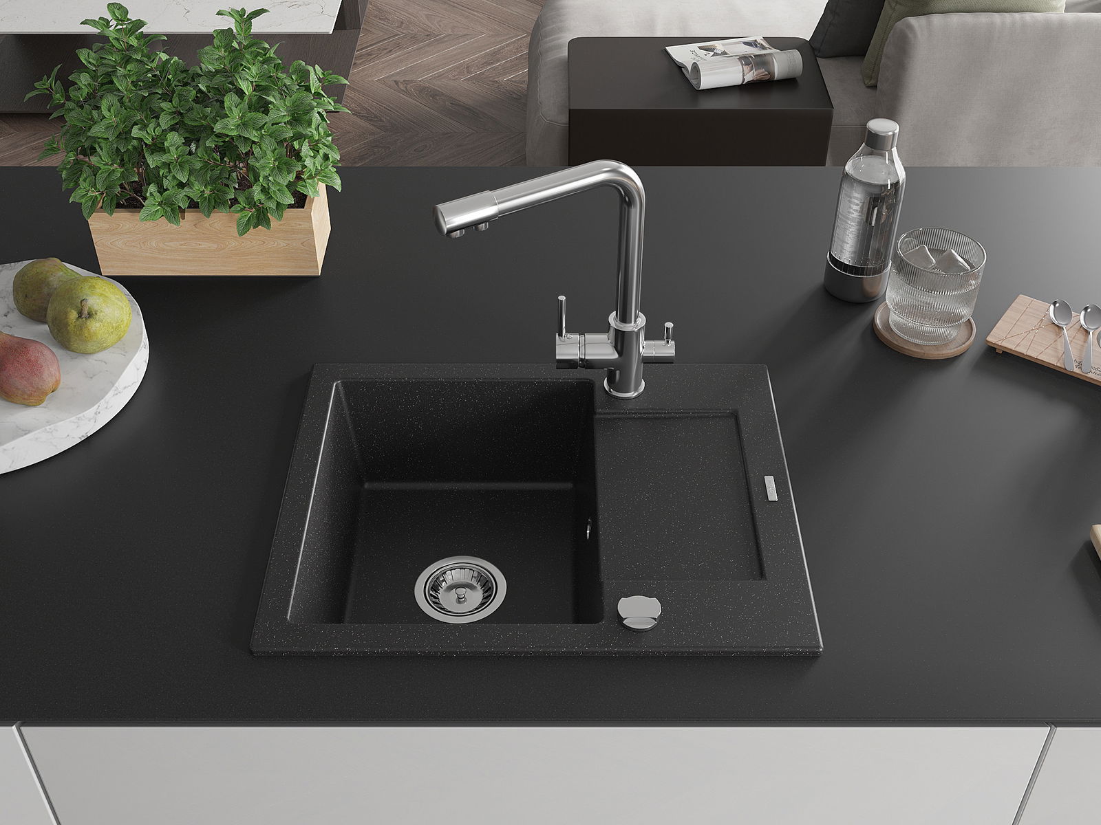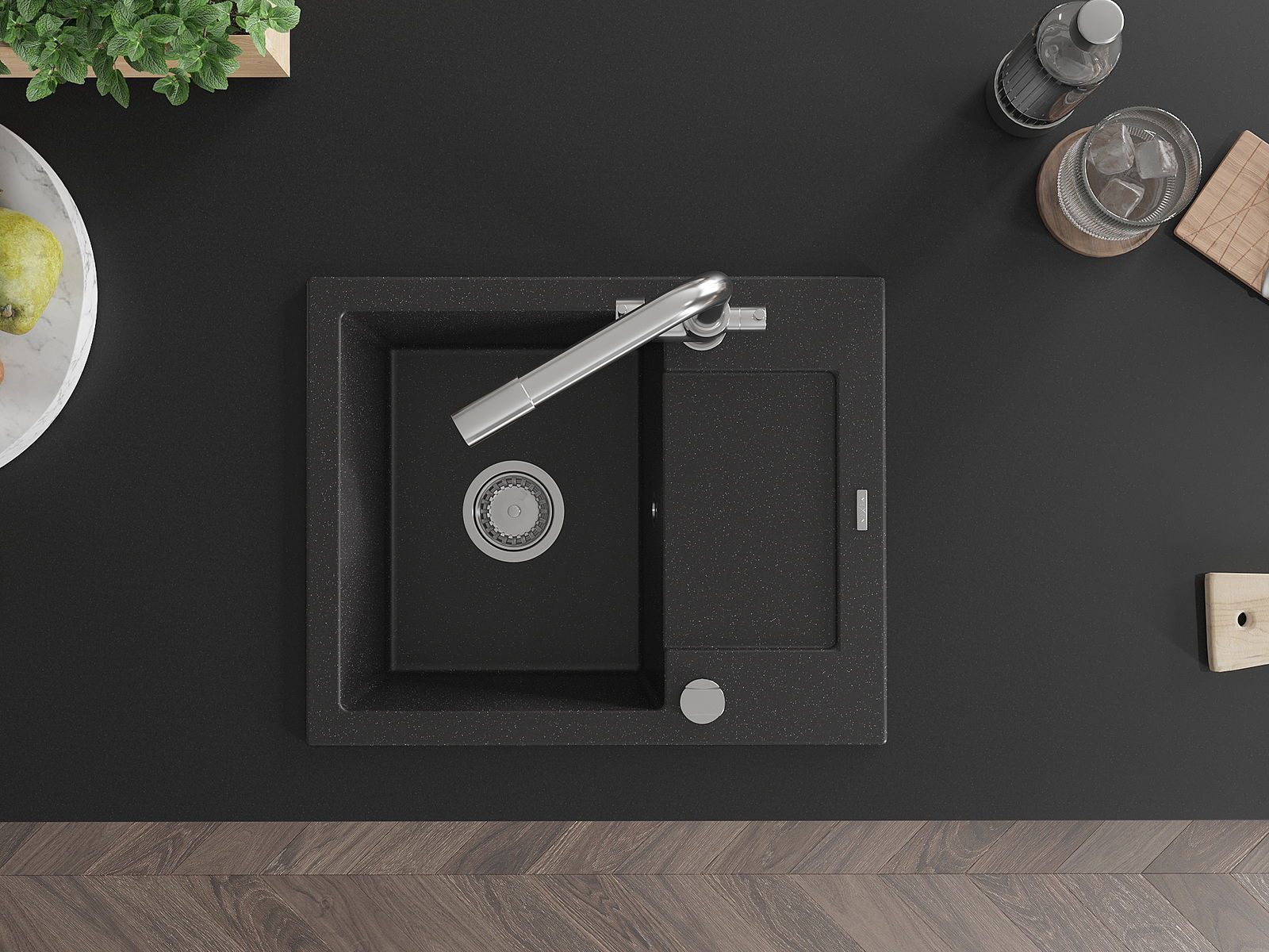 Mexen Enzo évier en granit à un bac avec égouttoir et robinet de cuisine Duero, noir/métallisé argent - 6506-73-671600-00