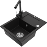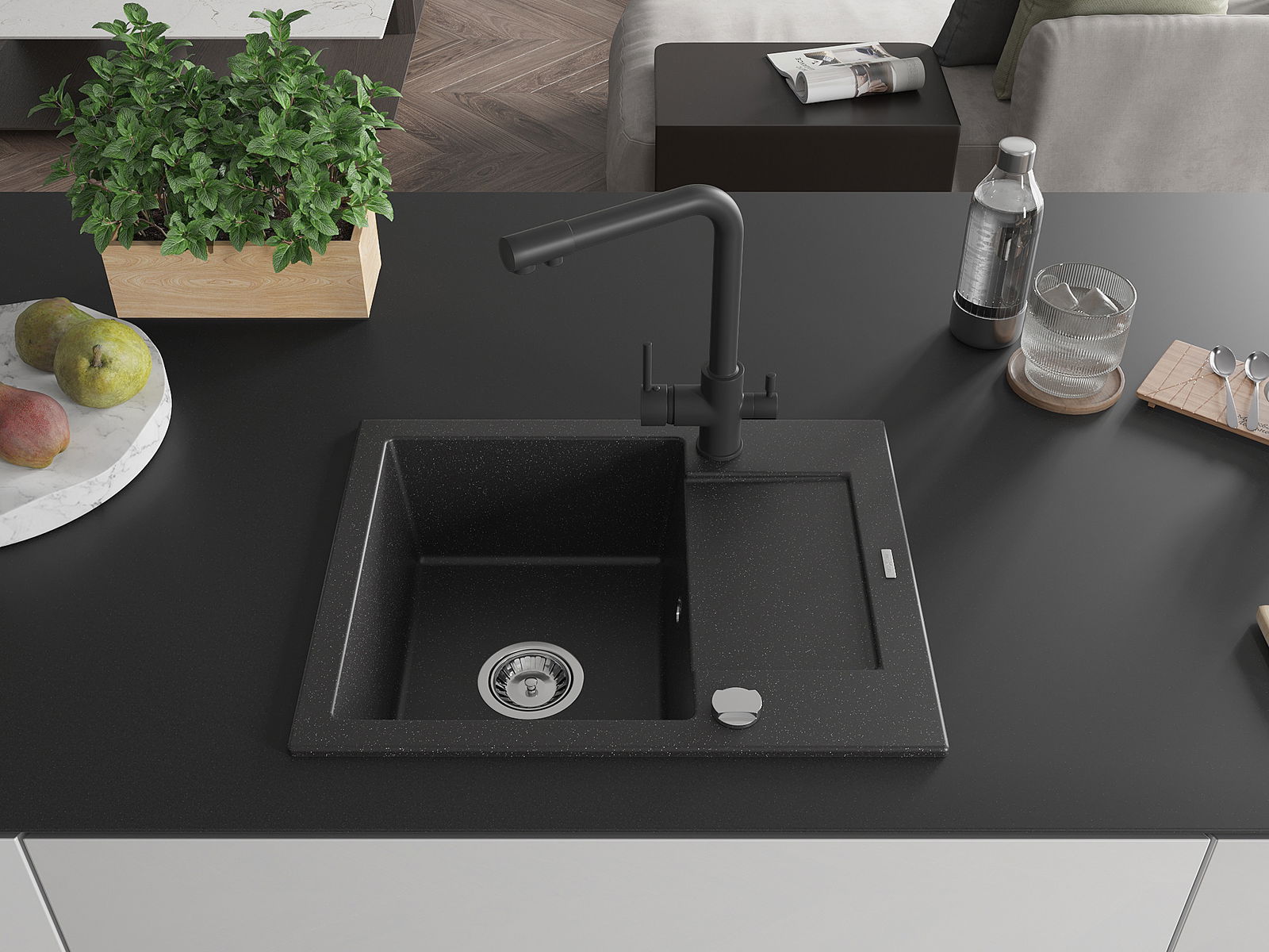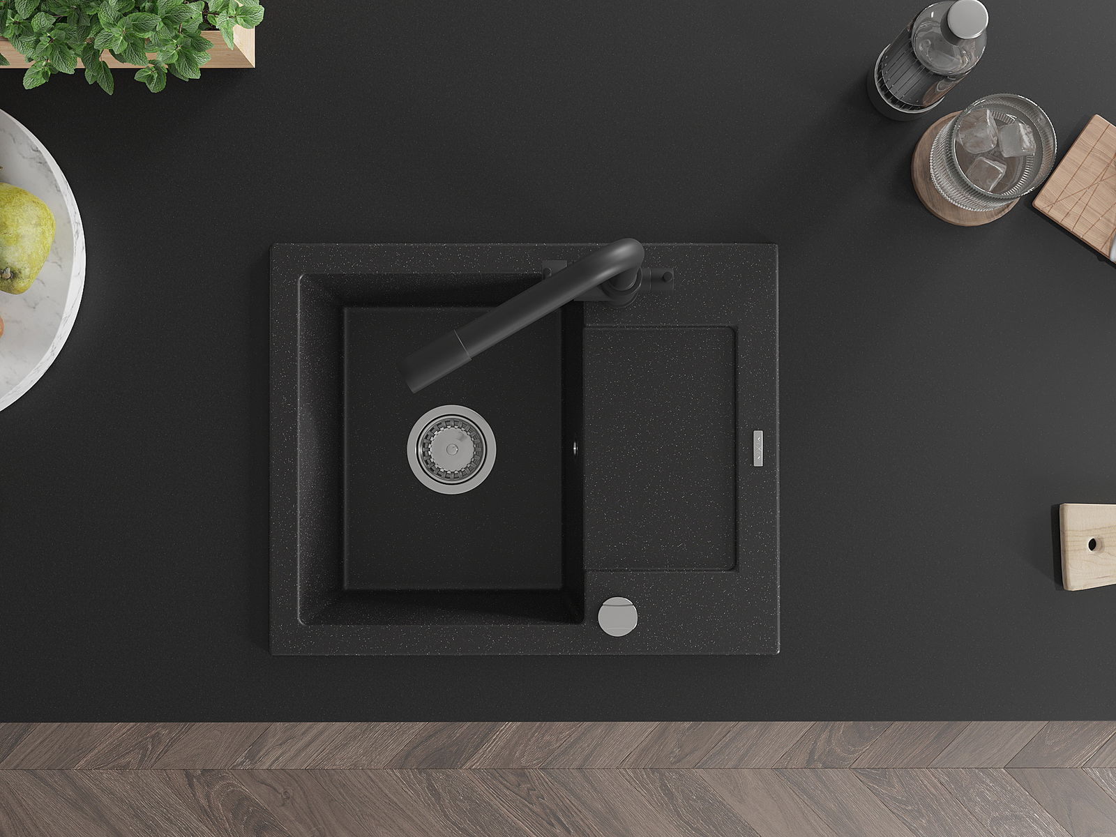 Mexen Enzo évier en granit à 1 bac avec égouttoir et robinet de cuisine Duero, noir/métal argenté - 6506-73-671600-70