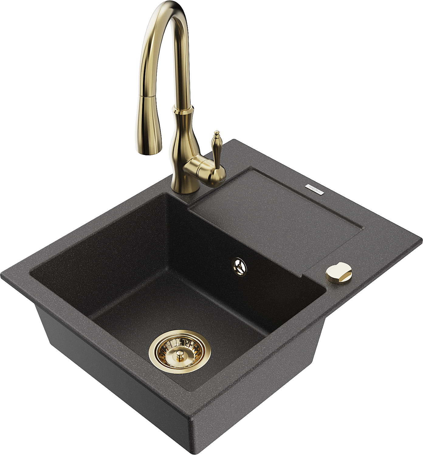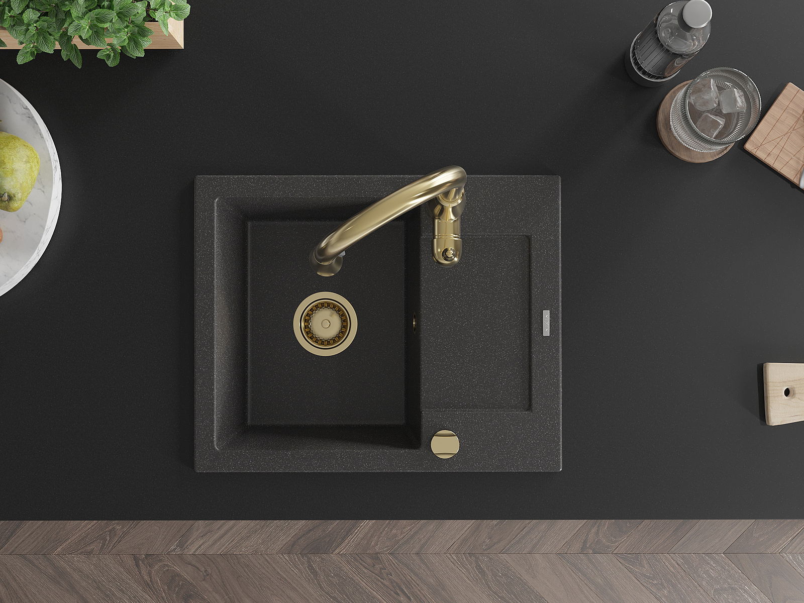 Mexen Enzo évier granit 1 bac avec égouttoir et robinet de cuisine Savita, noir moucheté - 6506-76-672601-50