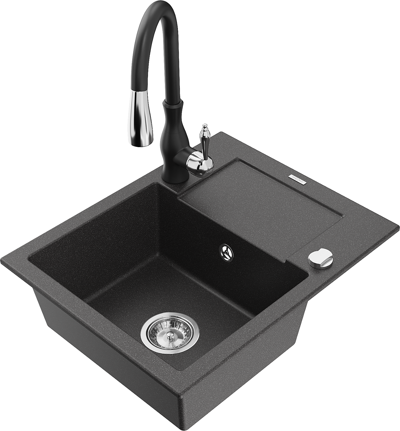 Mexen Enzo évier en granit 1 bac avec égouttoir et robinet de cuisine Savita, noir moucheté - 6506-76-672601-70