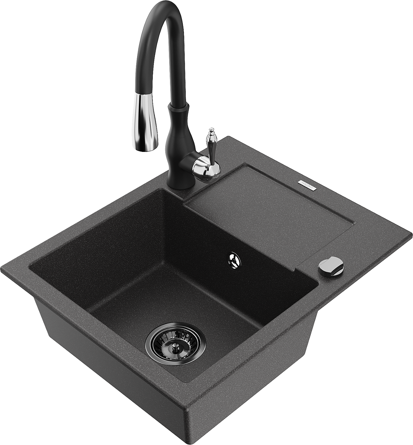 Mexen Enzo évier en granit 1 bac avec égouttoir et robinet de cuisine Savita, noir moucheté - 6506-76-672601-70-B