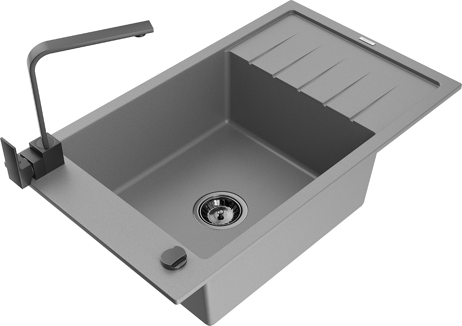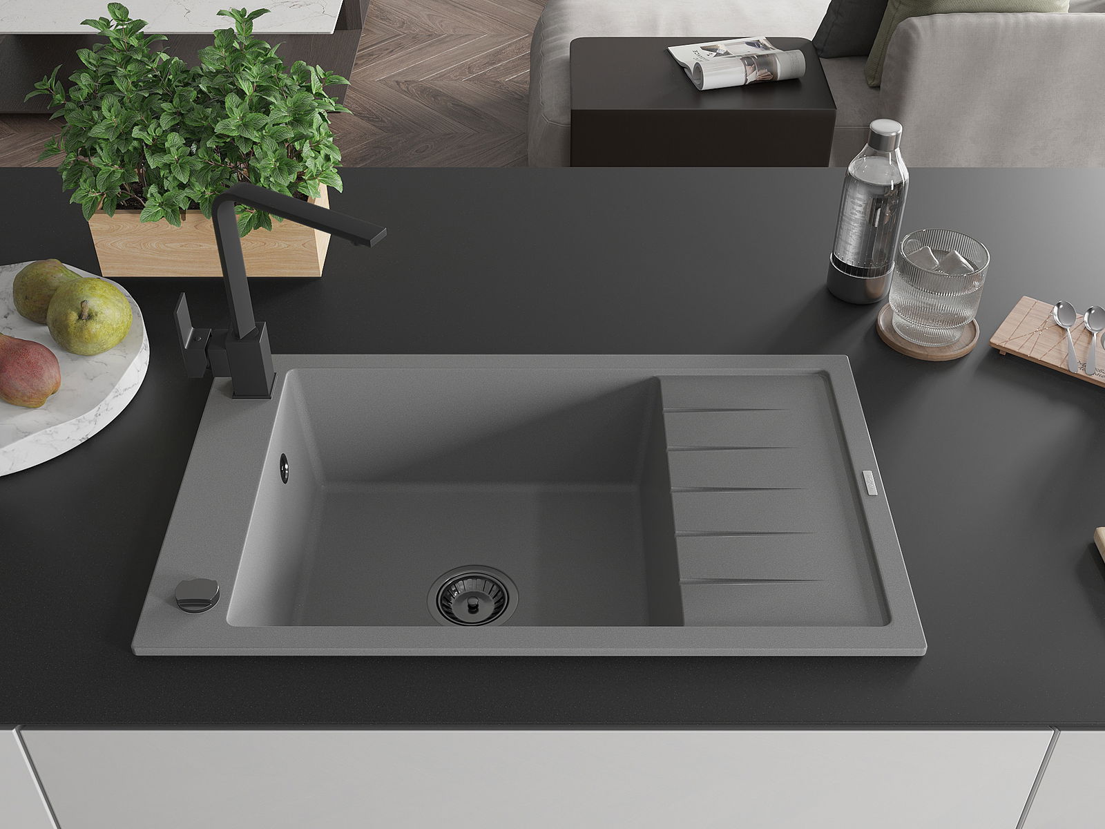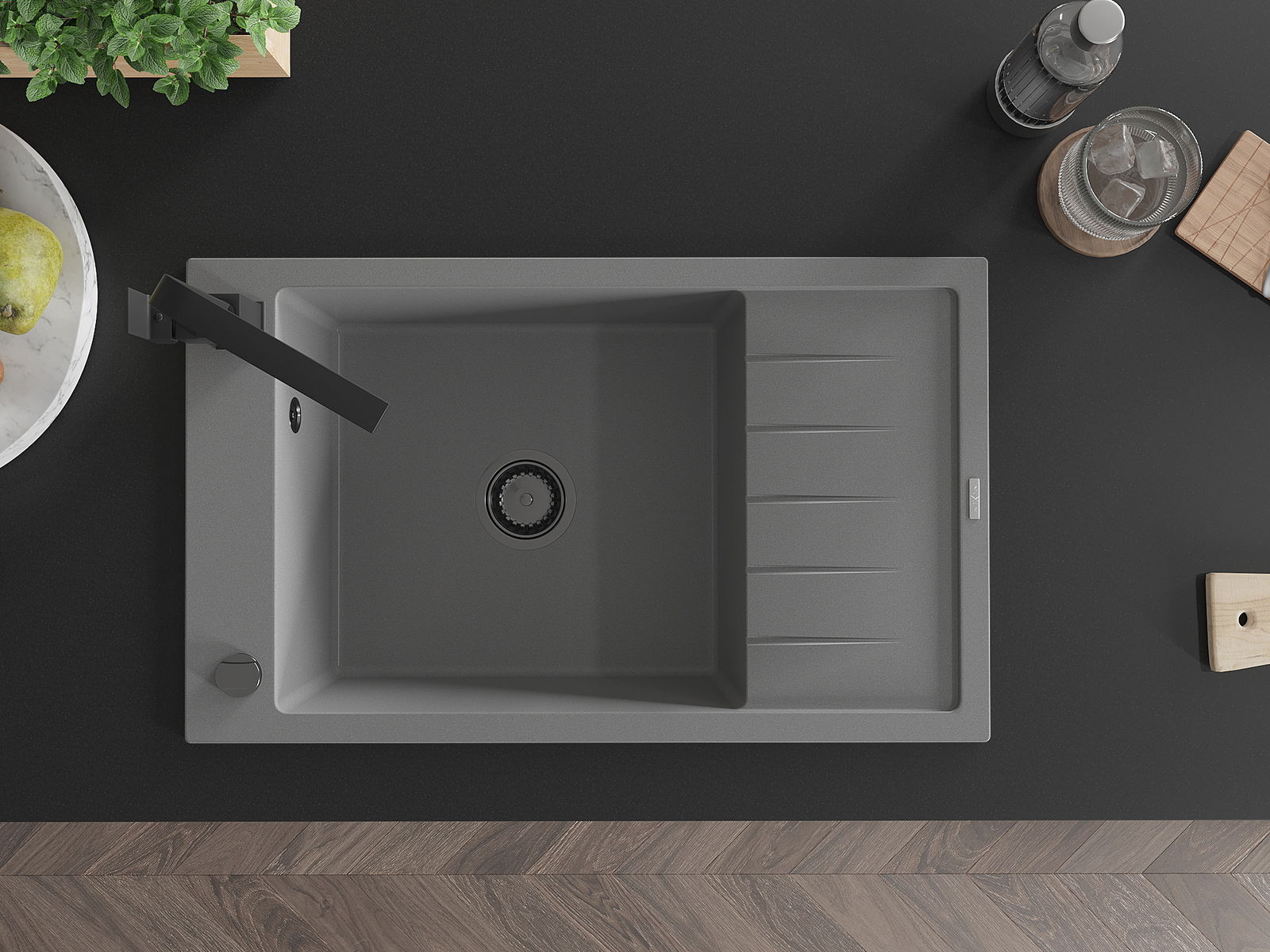 Mexen Elias évier en granit 1 bac avec égouttoir et robinet de cuisine Rita, gris - 6511-71-670300-70-B